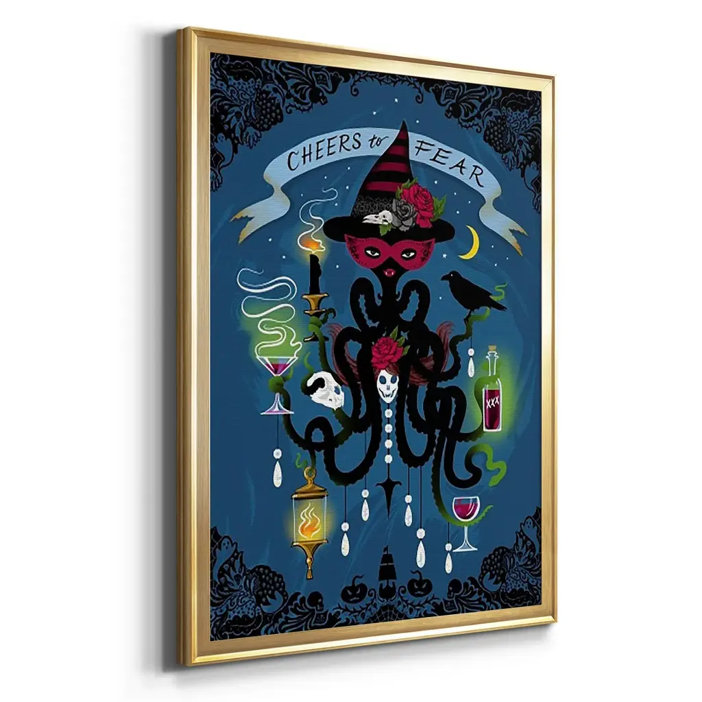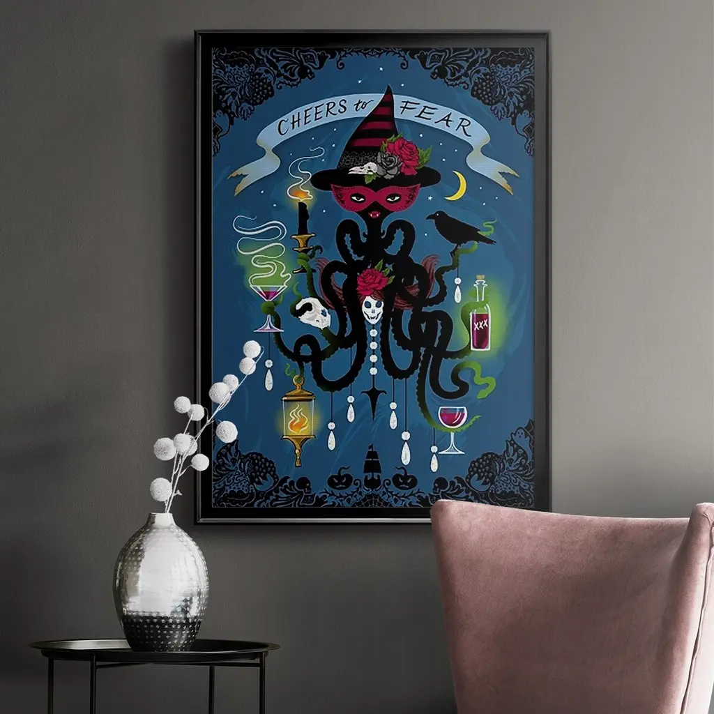 Spooky Cephalopod Chandeliers I Premium Framed Print - Ready to Hang A Premium Framed Print created to last. Framed in distressed wood and available in an array of sizes and colors Featuring a beveled a solid wood stretcher bar, each piece comes ready to hand 4 SIZES AVAILABLE 30.5''X42.5'' - Overall Size 26.5'X36.5'' - Overall Size 22.5''x30.5'' - Overall Size 18.5''x24.5'' - Overall Size Each piece is made to order. Each piece comes with hanging hardware. Made in the USA Ready to Hang