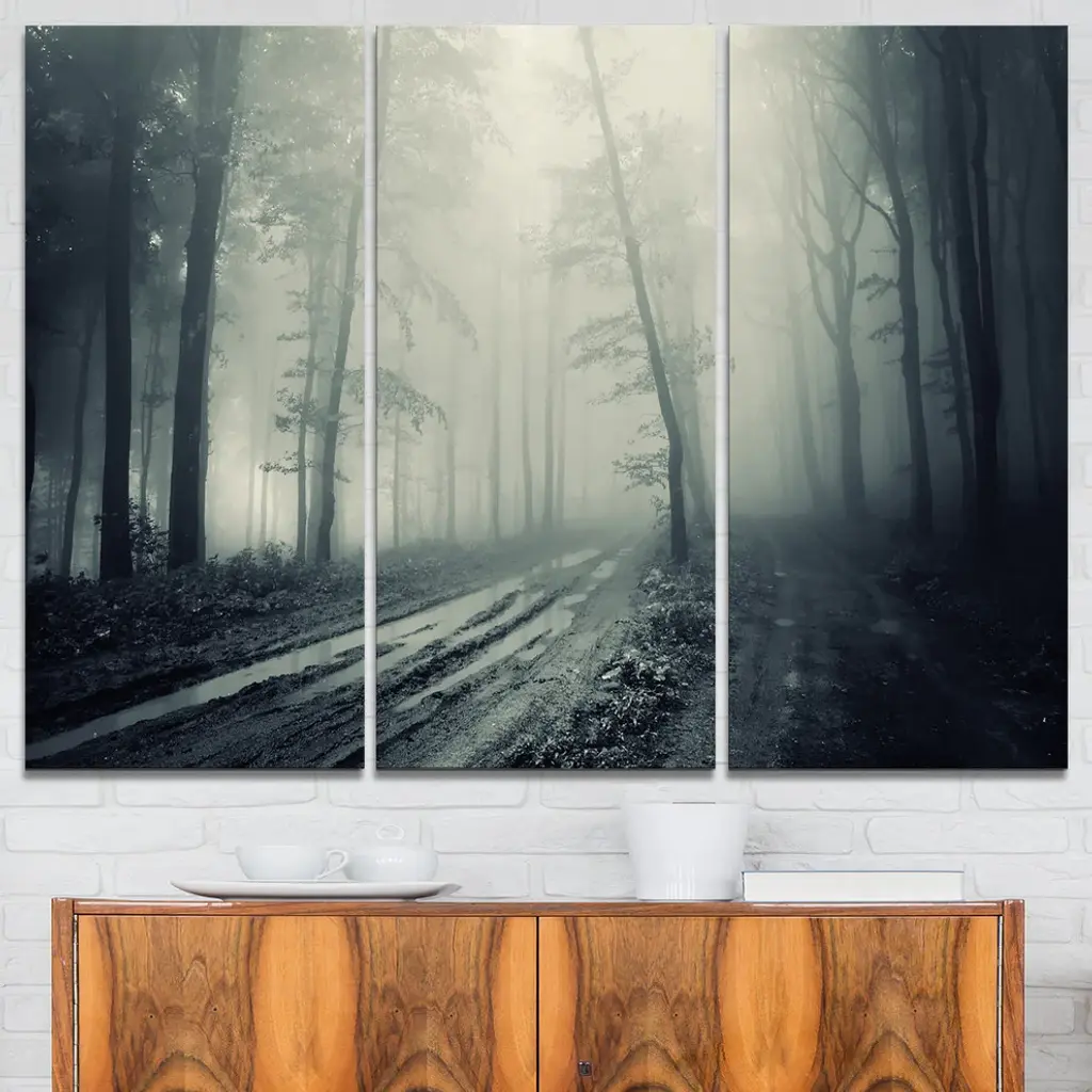 The Spooky Dark Forest with Fog canvas art print is sure to make an impression on anyone who sees it. This artwork is gallery wrapped around a 1-inch solid wood frame and arrives carefully packaged and entirely ready to hang on the wall. Design Art only uses the highest resolution and pigments to ensure a crisp colorful print that is never faded or pixelated. This artwork is sure to be a conversation starter in any home or office.