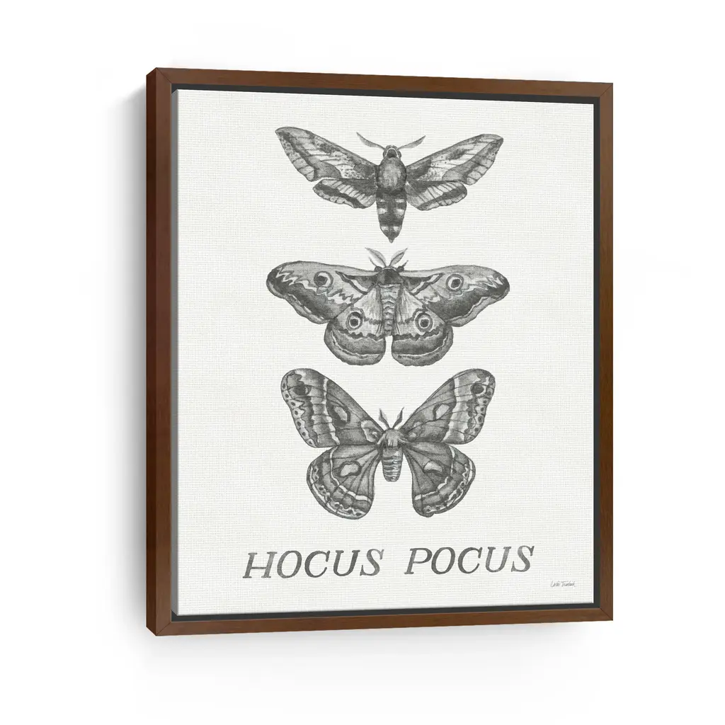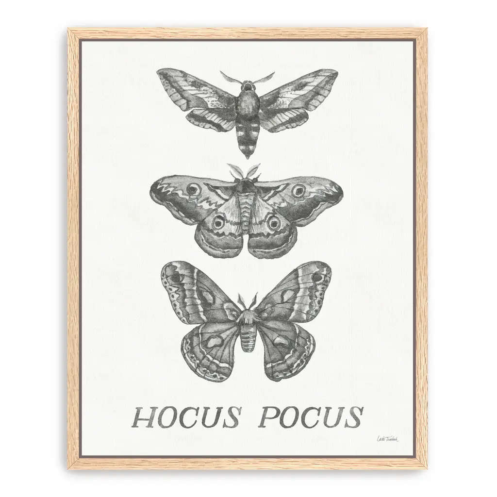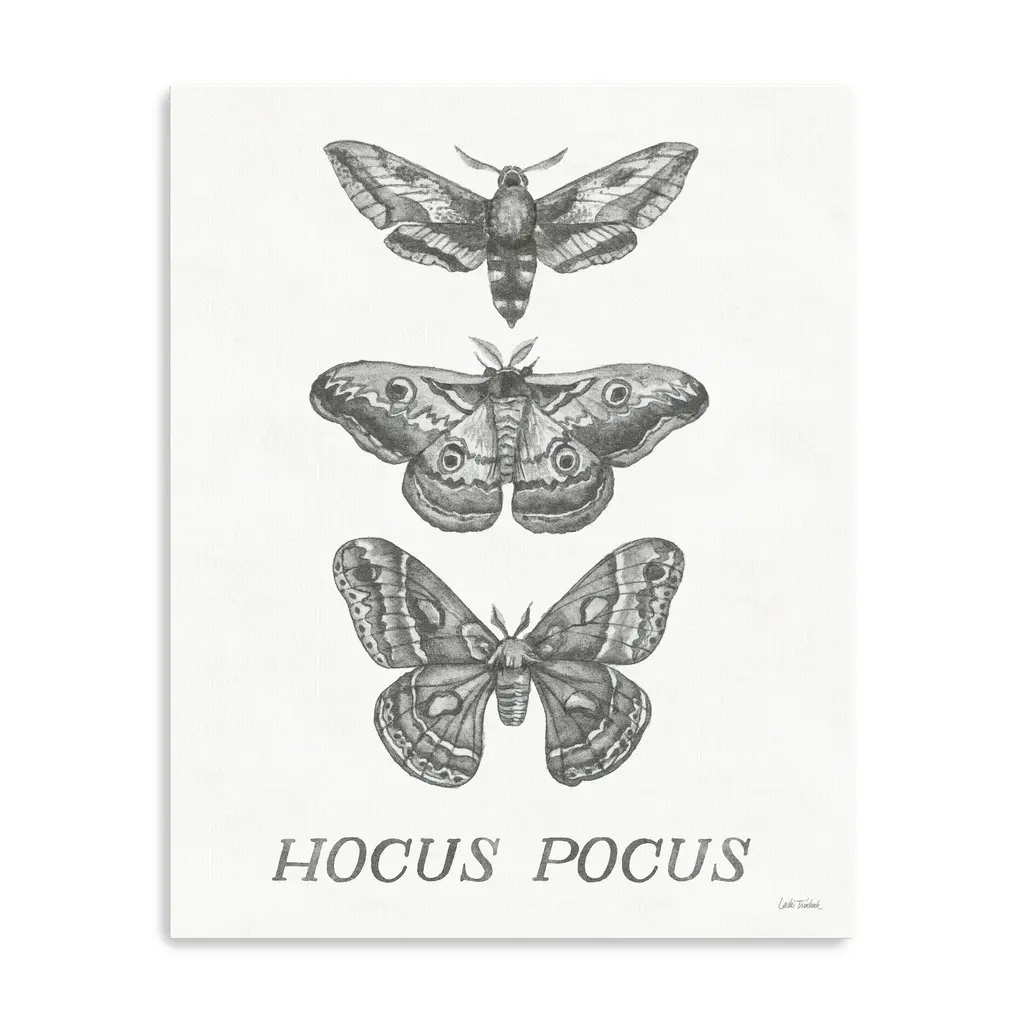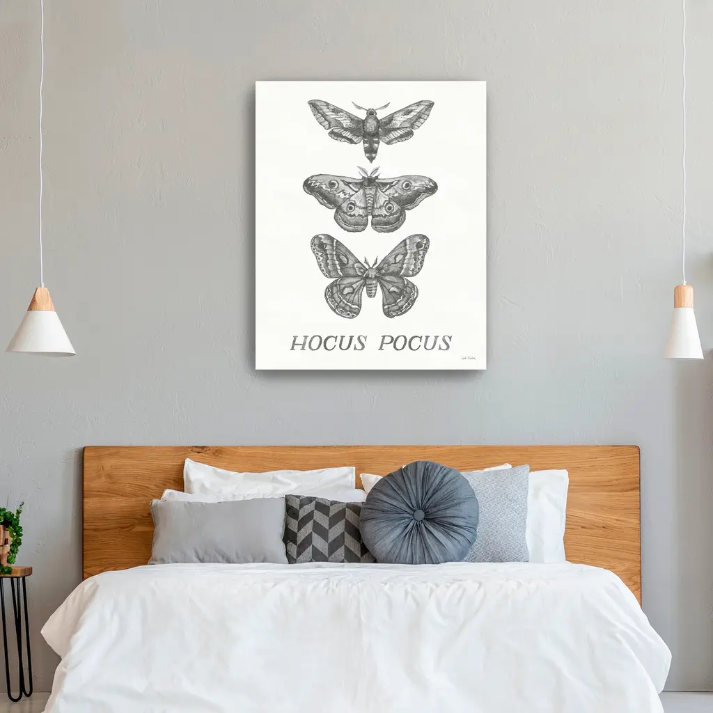 This elegant Halloween artwork features three symmetrical moths and a touch of magic in its clean "Hocus Pocus" typography. The grayscale palette and botanical style offer a modern twist on spooky season decor. Our Gallery Wrap Canvas Prints are proudly assembled with high quality materials in California, USA. Each piece is printed on a thick, archival grade canvas using Giclee technology. It is then hand-stretched by our experienced artisans over solid wood bars, which will not warp over time. The final product is a piece personally crafted for you to confidently display on your wall. Care and Assembly: Ensure that the location of your piece has little to no exposure to heat, sunlight, and moisture. Wipe clean, only if needed. Each piece includes hanging hardware to hang on your wall vertically.