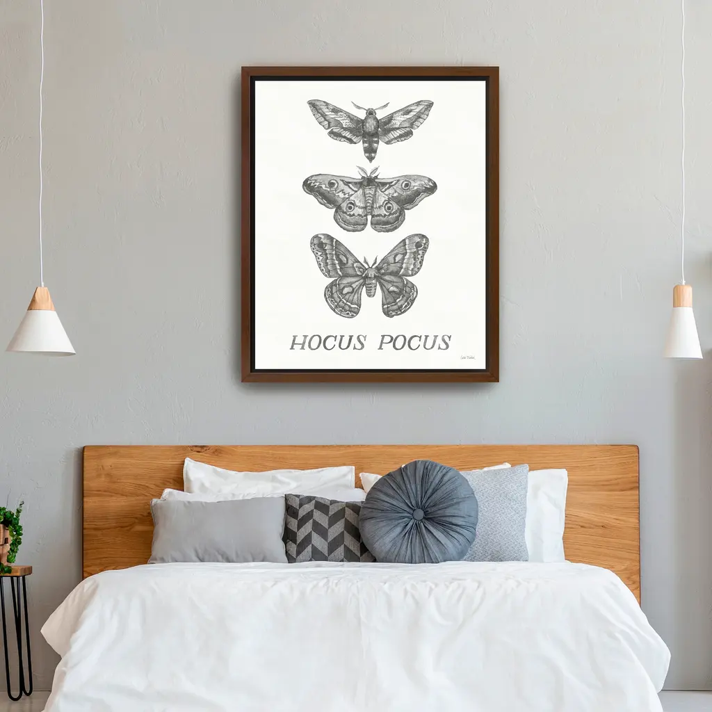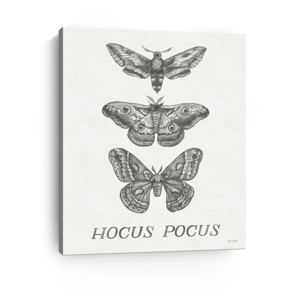 This elegant Halloween artwork features three symmetrical moths and a touch of magic in its clean "Hocus Pocus" typography. The grayscale palette and botanical style offer a modern twist on spooky season decor. Our Gallery Wrap Canvas Prints are proudly assembled with high quality materials in California, USA. Each piece is printed on a thick, archival grade canvas using Giclee technology. It is then hand-stretched by our experienced artisans over solid wood bars, which will not warp over time. The final product is a piece personally crafted for you to confidently display on your wall. Care and Assembly: Ensure that the location of your piece has little to no exposure to heat, sunlight, and moisture. Wipe clean, only if needed. Each piece includes hanging hardware to hang on your wall vertically.