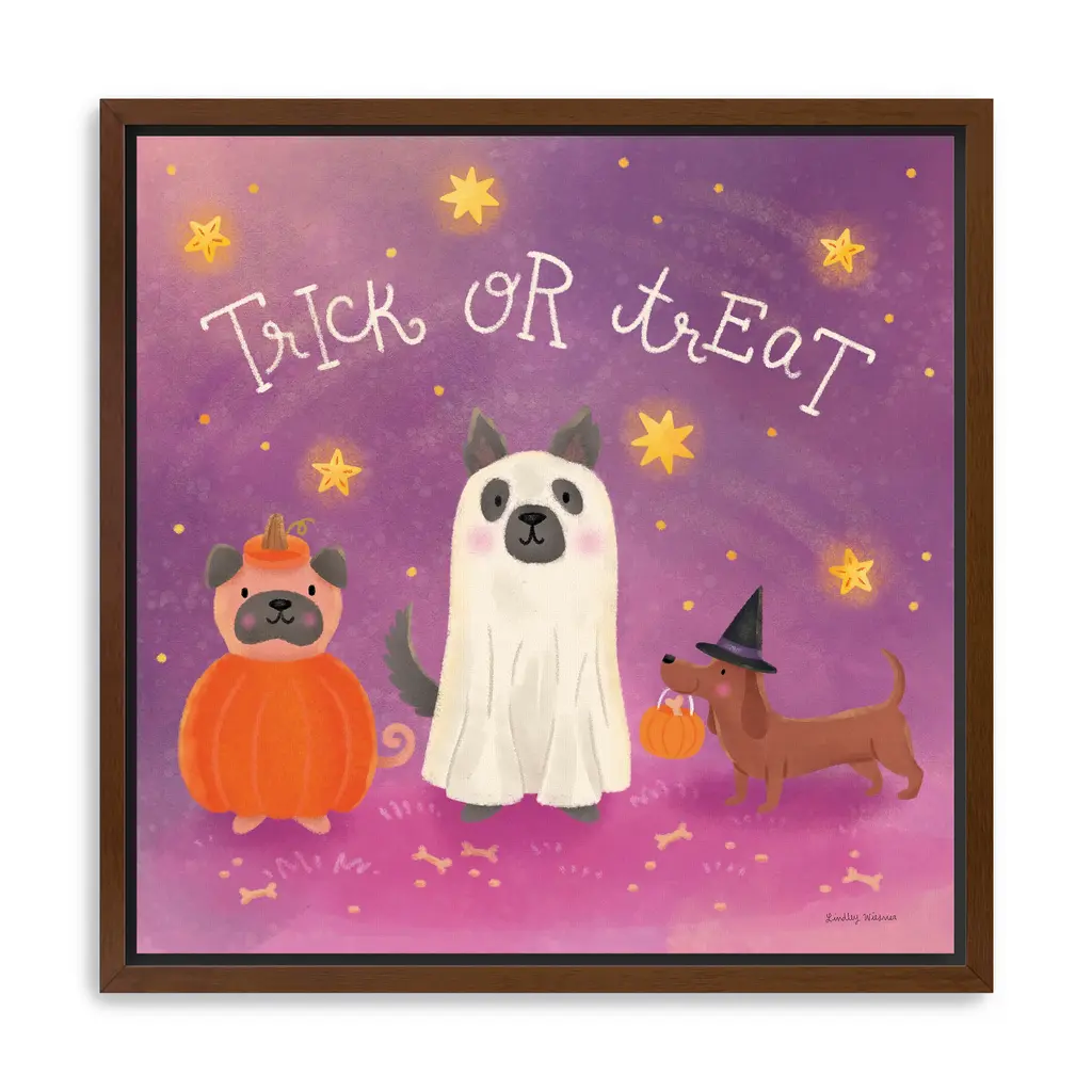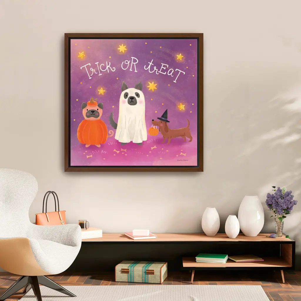 Dressed in whimsical Halloween attire, this trio of pups stroll under a purple, star-filled sky. Deep plum shadows and shimmering yellow accents add drama and delight Our Gallery Wrap Canvas Prints are proudly assembled with high quality materials in California, USA. Each piece is printed on a thick, archival grade canvas using Giclee technology. It is then hand-stretched by our experienced artisans over solid wood bars, which will not warp over time. The final product is a piece personally crafted for you to confidently display on your wall. Care and Assembly: Ensure that the location of your piece has little to no exposure to heat, sunlight, and moisture. Wipe clean, only if needed. Each piece includes hanging hardware to hang on your wall horizontally.