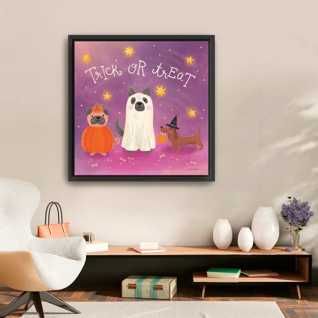 Dressed in whimsical Halloween attire, this trio of pups stroll under a purple, star-filled sky. Deep plum shadows and shimmering yellow accents add drama and delight Our Gallery Wrap Canvas Prints are proudly assembled with high quality materials in California, USA. Each piece is printed on a thick, archival grade canvas using Giclee technology. It is then hand-stretched by our experienced artisans over solid wood bars, which will not warp over time. The final product is a piece personally crafted for you to confidently display on your wall. Care and Assembly: Ensure that the location of your piece has little to no exposure to heat, sunlight, and moisture. Wipe clean, only if needed. Each piece includes hanging hardware to hang on your wall horizontally.