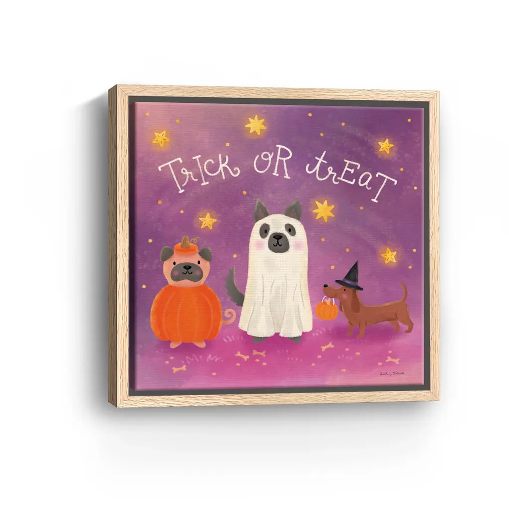 Dressed in whimsical Halloween attire, this trio of pups stroll under a purple, star-filled sky. Deep plum shadows and shimmering yellow accents add drama and delight Our Gallery Wrap Canvas Prints are proudly assembled with high quality materials in California, USA. Each piece is printed on a thick, archival grade canvas using Giclee technology. It is then hand-stretched by our experienced artisans over solid wood bars, which will not warp over time. The final product is a piece personally crafted for you to confidently display on your wall. Care and Assembly: Ensure that the location of your piece has little to no exposure to heat, sunlight, and moisture. Wipe clean, only if needed. Each piece includes hanging hardware to hang on your wall horizontally.
