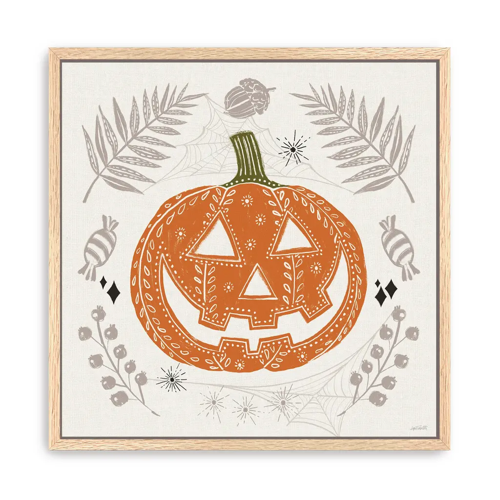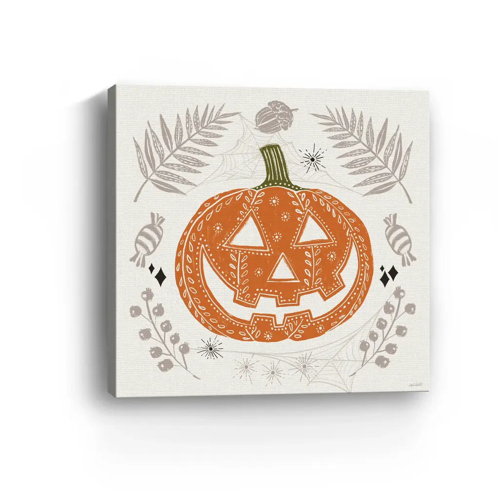 Celebrate spooky season with a cheerful jack-o'-lantern surrounded by soft taupe ferns, candy swirls, and playful spiders. This Halloween wall art blends rustic autumn tones with a folk-art twist, perfect for cozy October vibes. Our Gallery Wrap Canvas Prints are proudly assembled with high quality materials in California, USA. Each piece is printed on a thick, archival grade canvas using Giclee technology. It is then hand-stretched by our experienced artisans over solid wood bars, which will not warp over time. The final product is a piece personally crafted for you to confidently display on your wall. Care and Assembly: Ensure that the location of your piece has little to no exposure to heat, sunlight, and moisture. Wipe clean, only if needed. Each piece includes hanging hardware to hang on your wall horizontally.