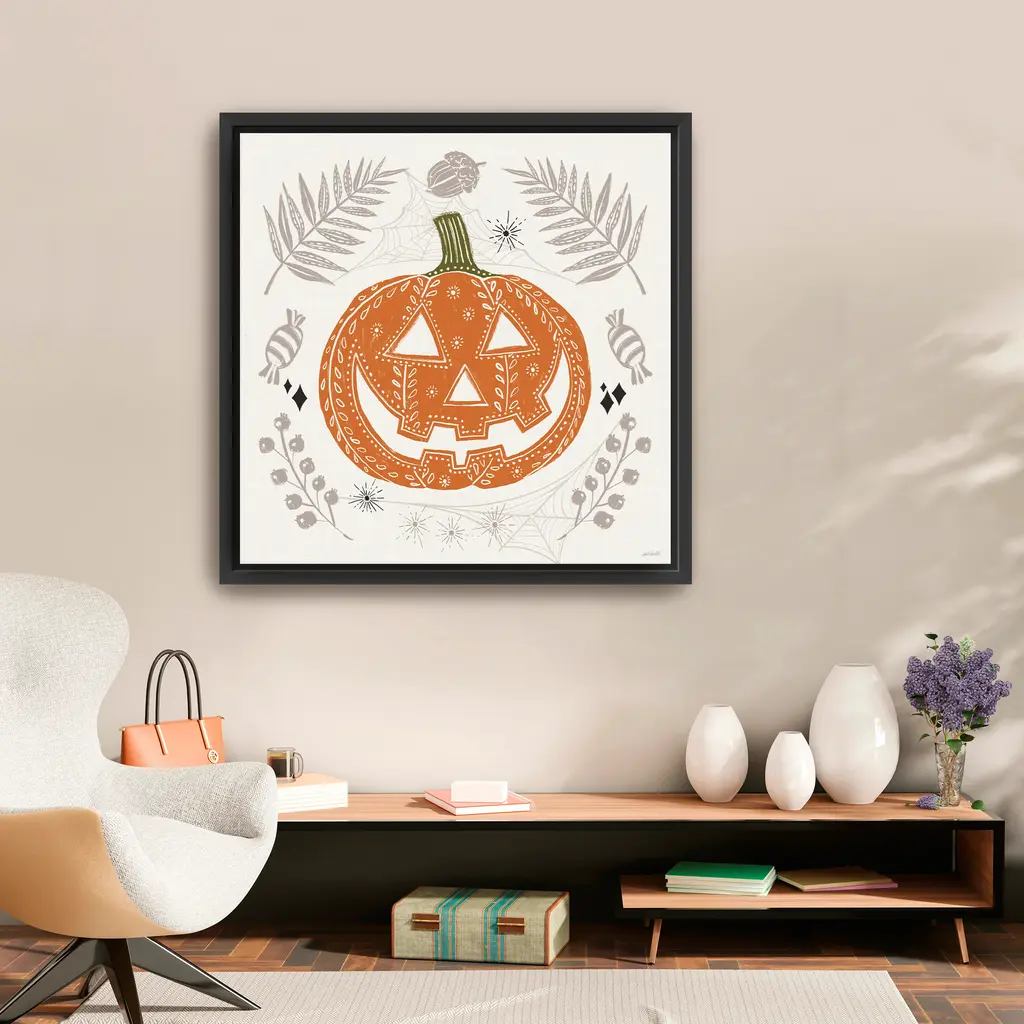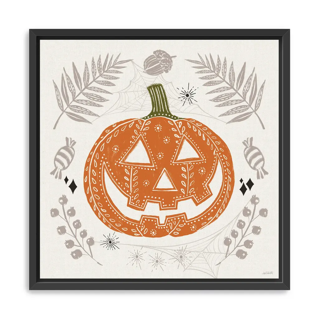 Celebrate spooky season with a cheerful jack-o'-lantern surrounded by soft taupe ferns, candy swirls, and playful spiders. This Halloween wall art blends rustic autumn tones with a folk-art twist, perfect for cozy October vibes. Our Gallery Wrap Canvas Prints are proudly assembled with high quality materials in California, USA. Each piece is printed on a thick, archival grade canvas using Giclee technology. It is then hand-stretched by our experienced artisans over solid wood bars, which will not warp over time. The final product is a piece personally crafted for you to confidently display on your wall. Care and Assembly: Ensure that the location of your piece has little to no exposure to heat, sunlight, and moisture. Wipe clean, only if needed. Each piece includes hanging hardware to hang on your wall horizontally.