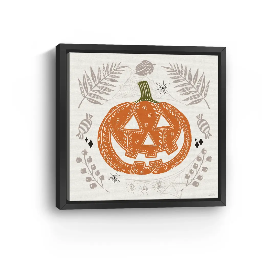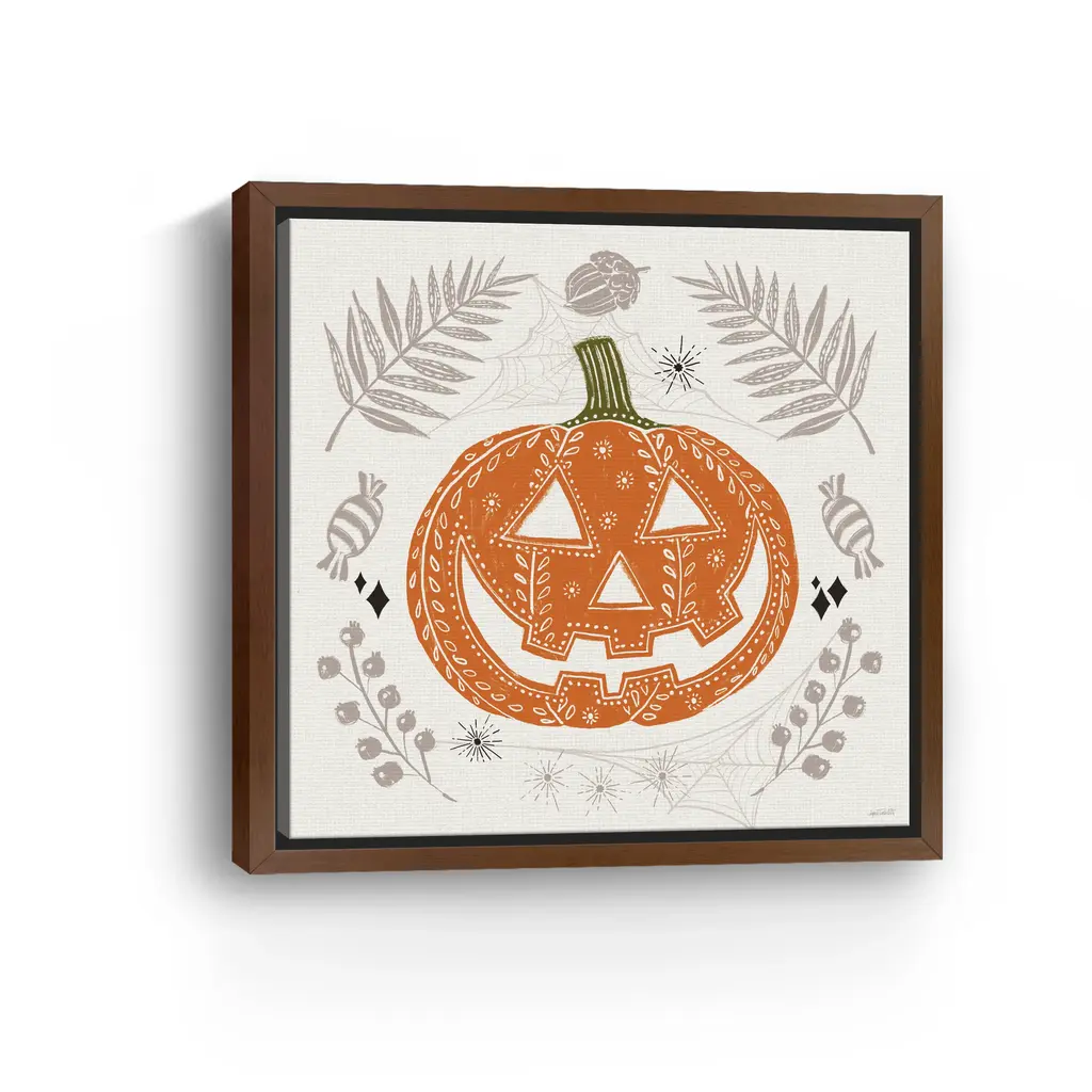 Celebrate spooky season with a cheerful jack-o'-lantern surrounded by soft taupe ferns, candy swirls, and playful spiders. This Halloween wall art blends rustic autumn tones with a folk-art twist, perfect for cozy October vibes. Our Gallery Wrap Canvas Prints are proudly assembled with high quality materials in California, USA. Each piece is printed on a thick, archival grade canvas using Giclee technology. It is then hand-stretched by our experienced artisans over solid wood bars, which will not warp over time. The final product is a piece personally crafted for you to confidently display on your wall. Care and Assembly: Ensure that the location of your piece has little to no exposure to heat, sunlight, and moisture. Wipe clean, only if needed. Each piece includes hanging hardware to hang on your wall horizontally.
