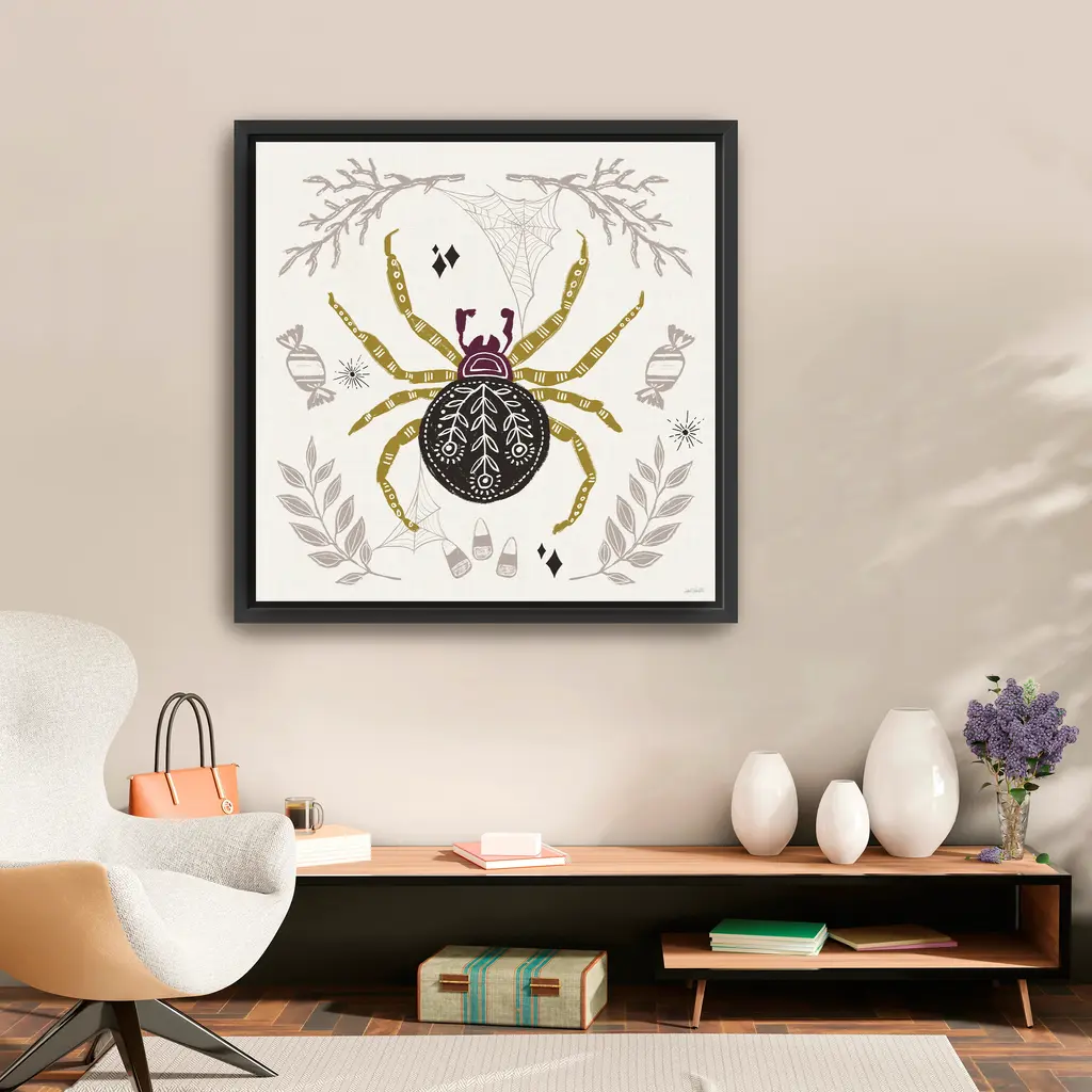 Celebrate spooky season with a spider surrounded by soft taupe ferns, candy swirls, and playful sparkles. This Halloween wall art blends rustic autumn tones with a folk-art twist, perfect for cozy October vibes. Our Gallery Wrap Canvas Prints are proudly assembled with high quality materials in California, USA. Each piece is printed on a thick, archival grade canvas using Giclee technology. It is then hand-stretched by our experienced artisans over solid wood bars, which will not warp over time. The final product is a piece personally crafted for you to confidently display on your wall. Care and Assembly: Ensure that the location of your piece has little to no exposure to heat, sunlight, and moisture. Wipe clean, only if needed. Each piece includes hanging hardware to hang on your wall horizontally.