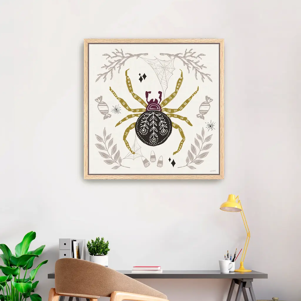 Celebrate spooky season with a spider surrounded by soft taupe ferns, candy swirls, and playful sparkles. This Halloween wall art blends rustic autumn tones with a folk-art twist, perfect for cozy October vibes. Our Gallery Wrap Canvas Prints are proudly assembled with high quality materials in California, USA. Each piece is printed on a thick, archival grade canvas using Giclee technology. It is then hand-stretched by our experienced artisans over solid wood bars, which will not warp over time. The final product is a piece personally crafted for you to confidently display on your wall. Care and Assembly: Ensure that the location of your piece has little to no exposure to heat, sunlight, and moisture. Wipe clean, only if needed. Each piece includes hanging hardware to hang on your wall horizontally.