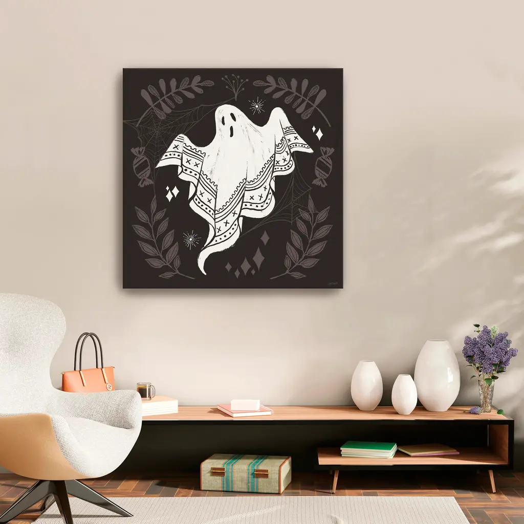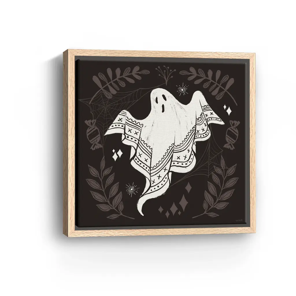 Celebrate spooky season with a blanket ghost surrounded by soft taupe ferns, candy swirls, and playful sparkles. This Halloween wall art blends rustic autumn tones with a folk-art twist, perfect for cozy October vibes. Our Gallery Wrap Canvas Prints are proudly assembled with high quality materials in California, USA. Each piece is printed on a thick, archival grade canvas using Giclee technology. It is then hand-stretched by our experienced artisans over solid wood bars, which will not warp over time. The final product is a piece personally crafted for you to confidently display on your wall. Care and Assembly: Ensure that the location of your piece has little to no exposure to heat, sunlight, and moisture. Wipe clean, only if needed. Each piece includes hanging hardware to hang on your wall horizontally.