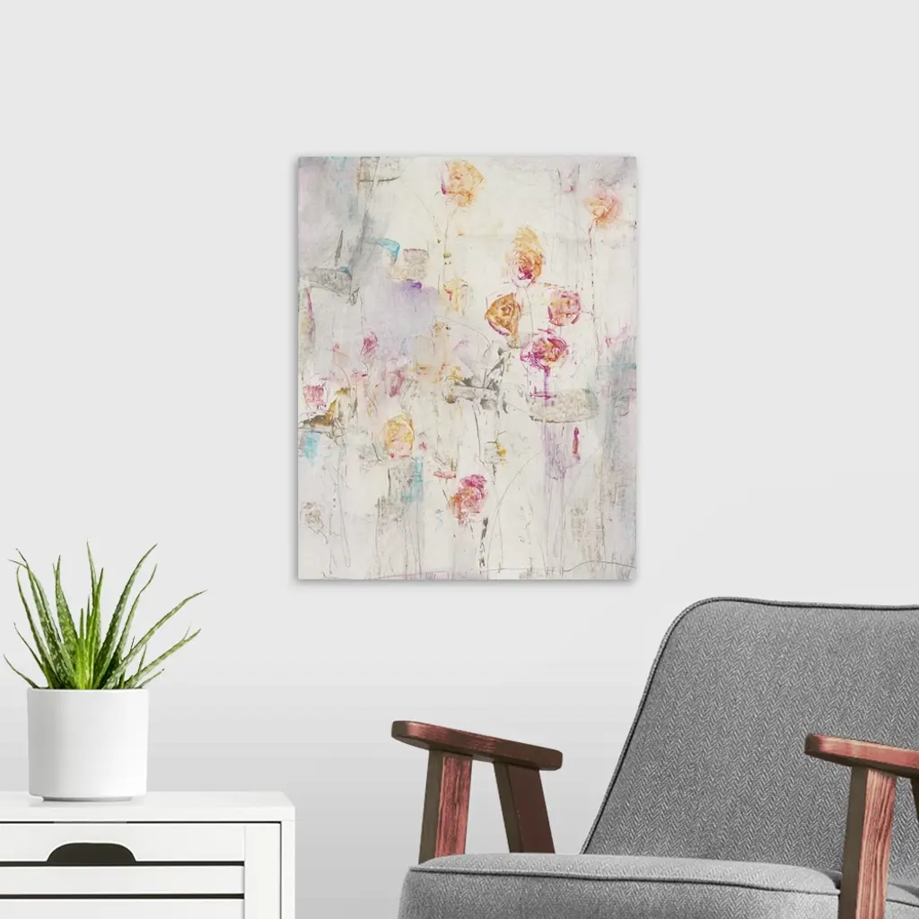 Contemporary abstract painting of colorful flowers through out an environment in neutral tones.