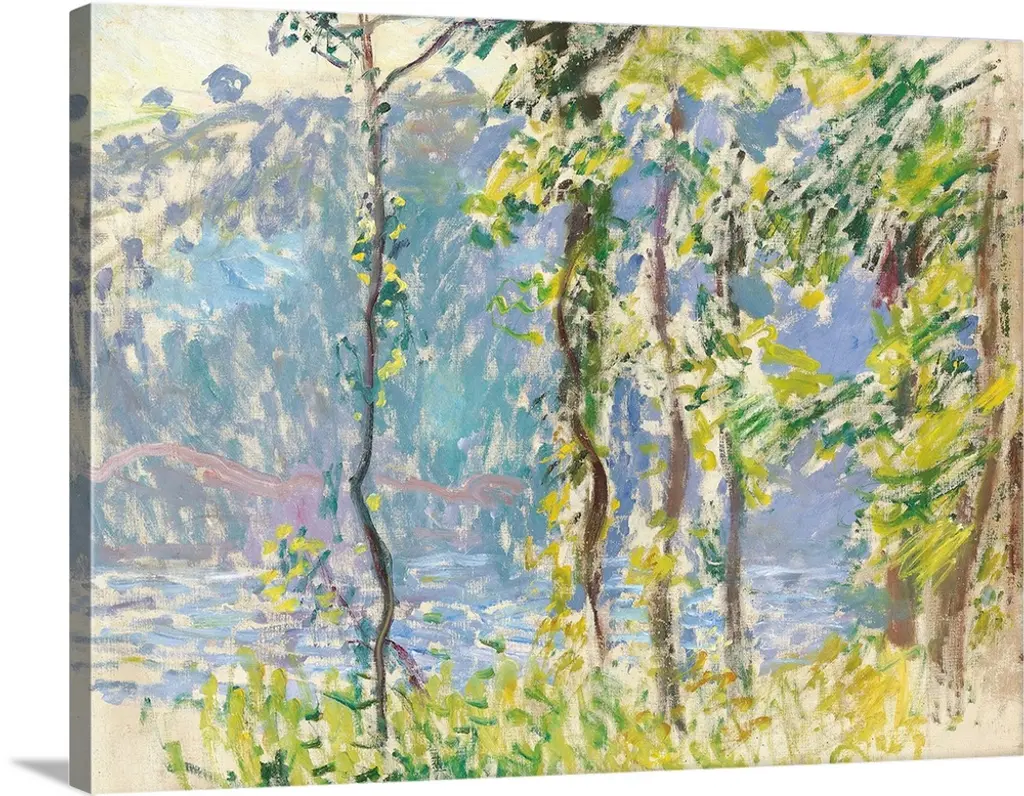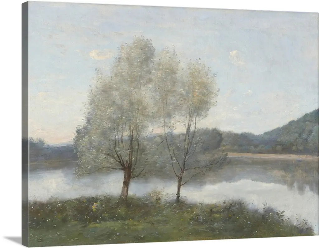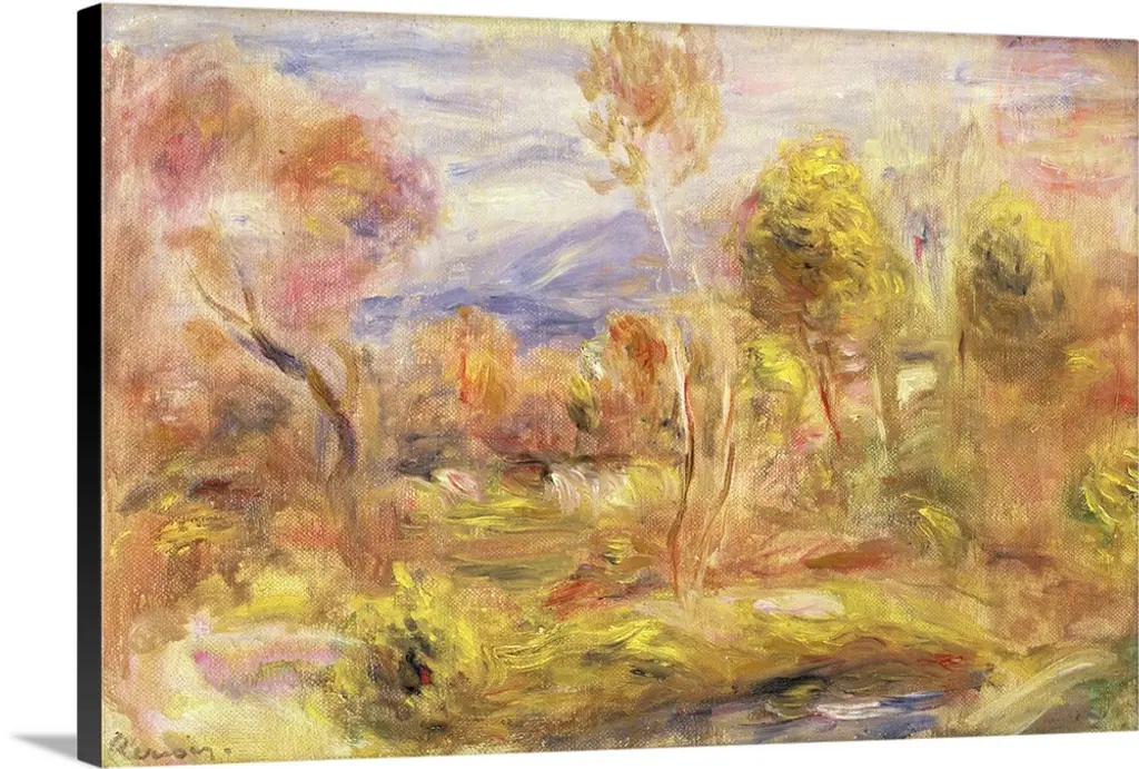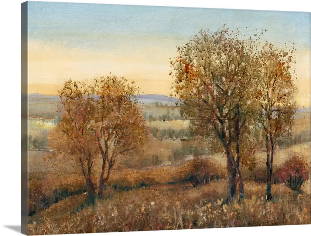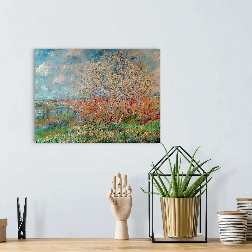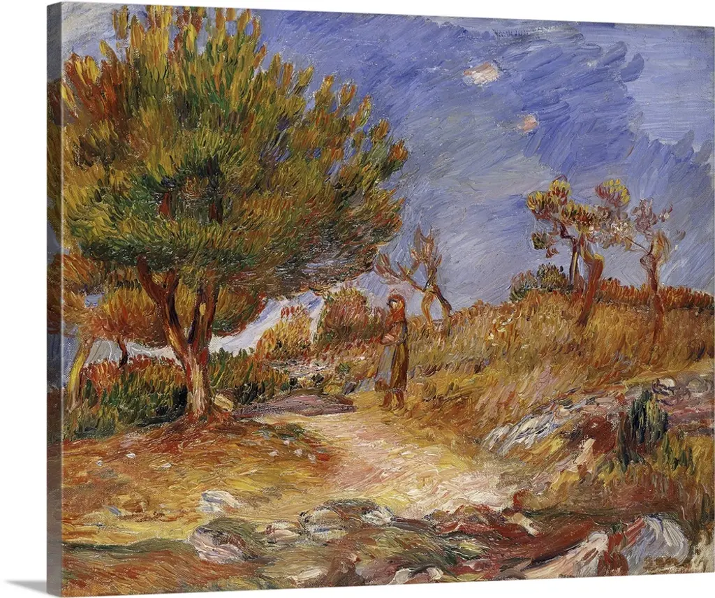 An Impressionist landscape painting of a small tree growing on a hill overlooking a valley.