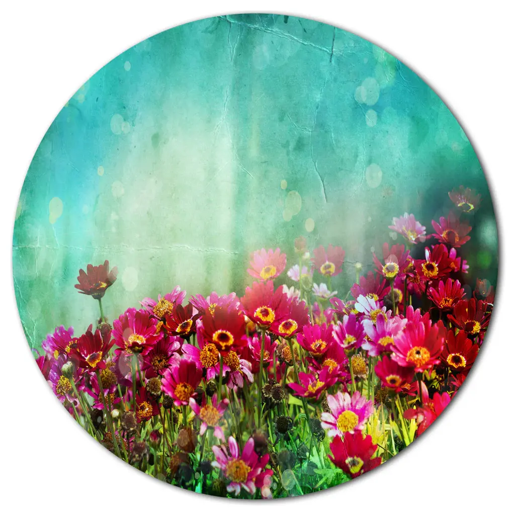 Bring Contemporary Abstraction to your home with this large Circle Metal wall art. This Spring Background with Little Flowers Metal Artwork makes it the focal point of any room or office. - White Gloss Coating ensures colors are extra vibrant with light reflection.- Aluminum grade Sheet Metal with 1 inch mounting frame on the back giving the illusion that the artwork is floating on the wall..- Mounting Brackets are included along with instructions.- High Quality Digital images are created directly into a glossy aluminum panel producing a stunning and captivating print into the glossy finish of the metal.- Water, Fire and Scratch resistant HD Aluminum panels.- Looks better than any photo paper and guaranteed to last at least 20 years- Easy to clean with a microfiber cloth. Colors are far superior to regular Canvas Art. - Easy to Hang