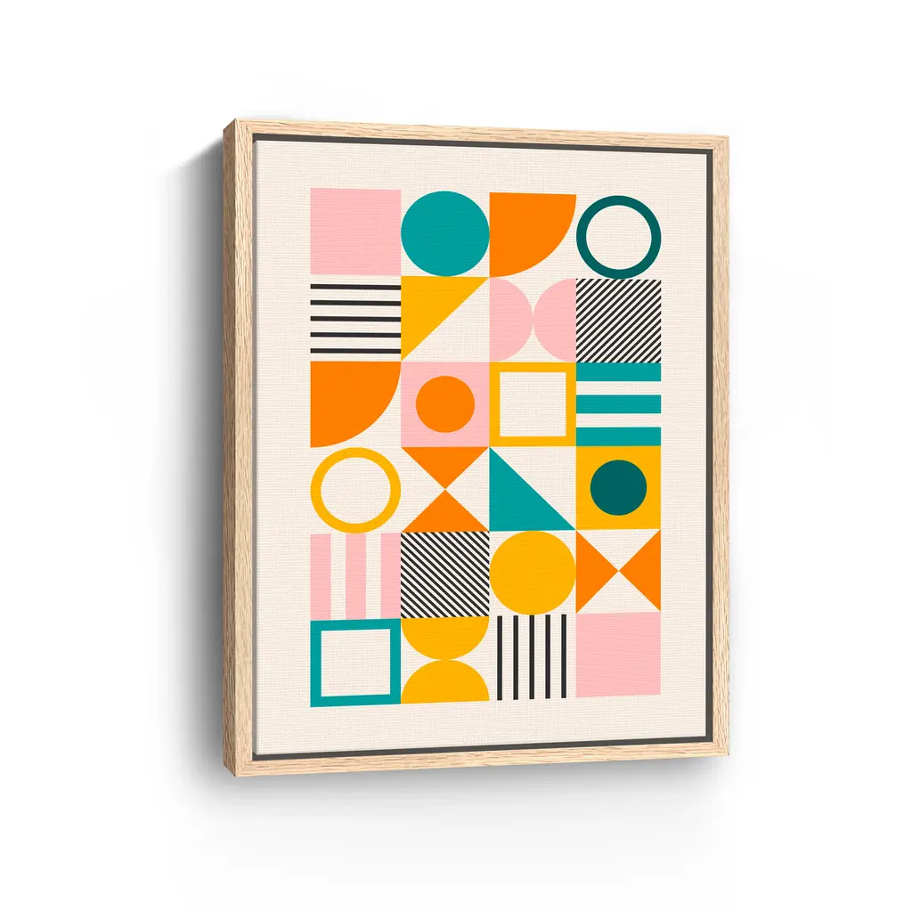 Channel retro charm with this abstract wall art, featuring crisp geometric forms in a warm, energetic palette of orange, pink, and aqua. Its clean lines and dynamic layout bring instant sophistication to any space. Our Gallery Wrap Canvas Prints are proudly assembled with high quality materials in California, USA. Each piece is printed on a thick, archival grade canvas using Giclee technology. It is then hand-stretched by our experienced artisans over solid wood bars, which will not warp over time. The final product is a piece personally crafted for you to confidently display on your wall. Care and Assembly: Ensure that the location of your piece has little to no exposure to heat, sunlight, and moisture. Wipe clean, only if needed. Each piece includes hanging hardware to hang on your wall vertically.
