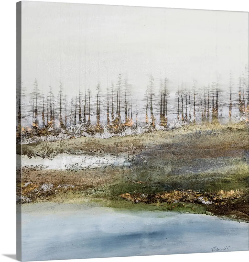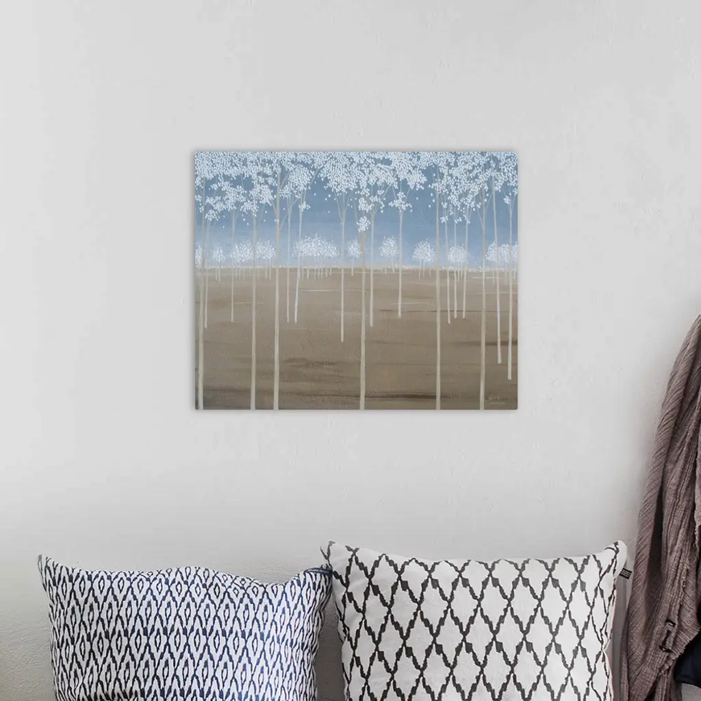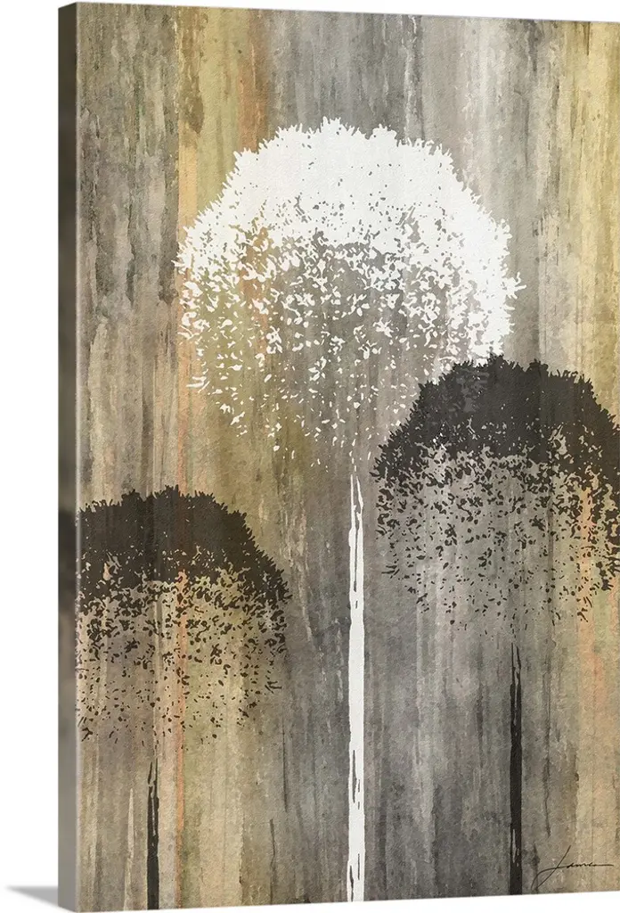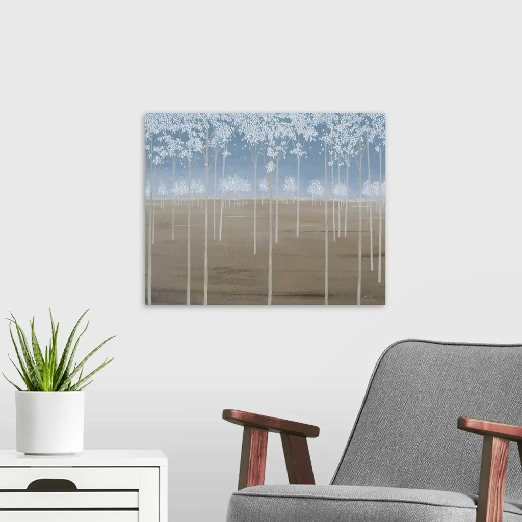 Minimalist painting of tall Spring trees with white blossoms.