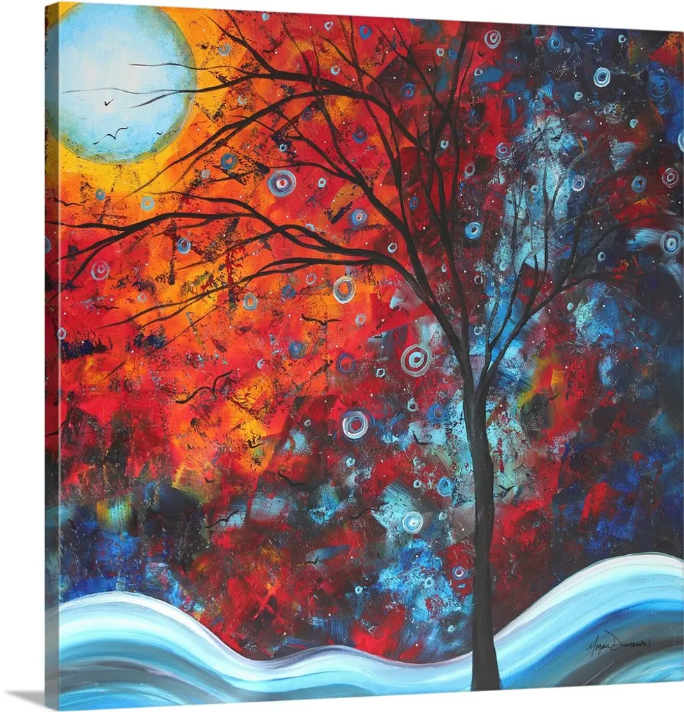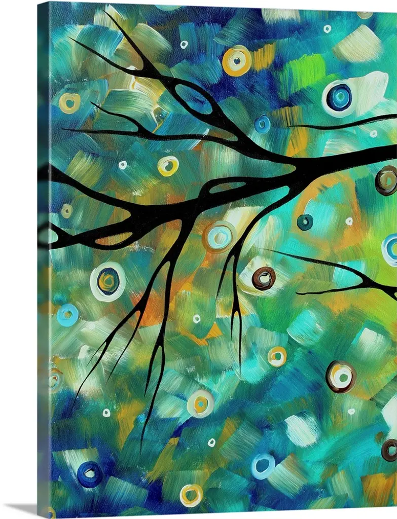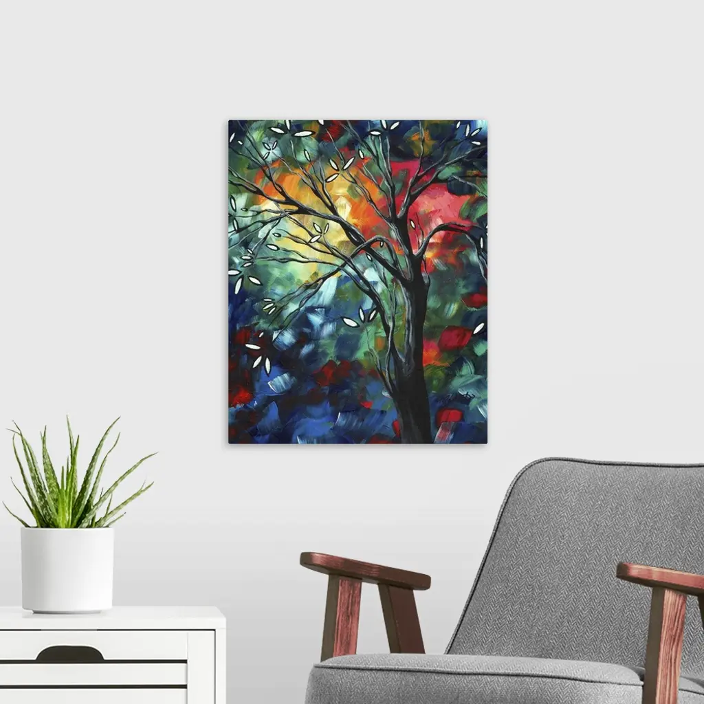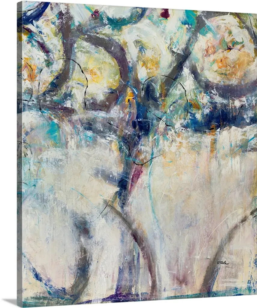 A vertical painting of a tree with flower buds getting ready to bloom. The background is multi colored with brush strokes applied in every direction.