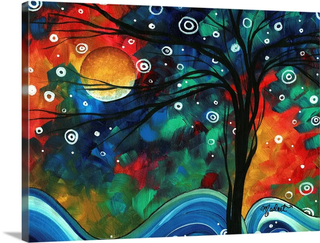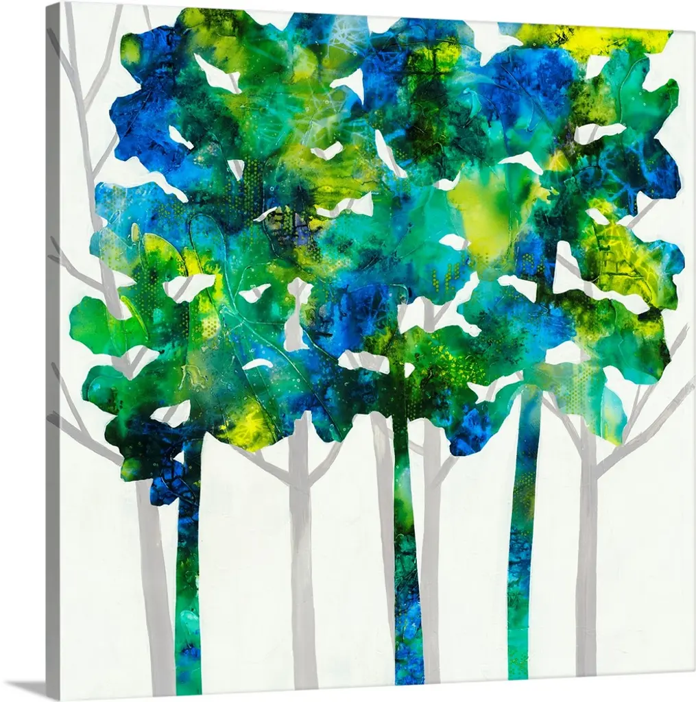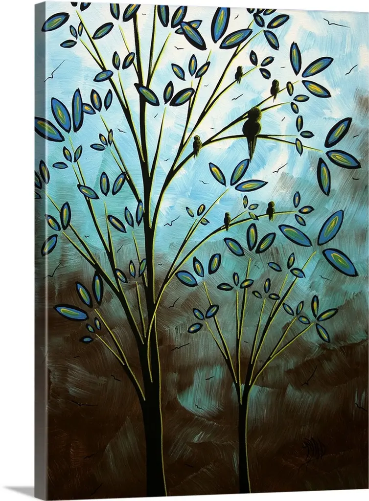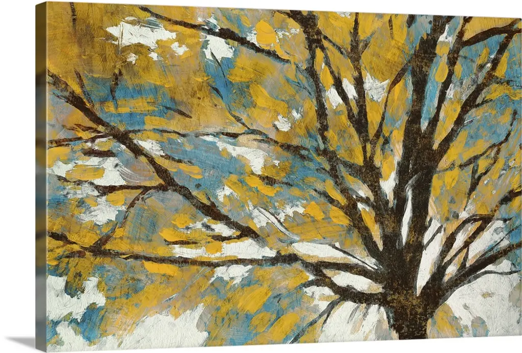 A vertical painting of a tree with flower buds getting ready to bloom. The background is multi colored with brush strokes applied in every direction.