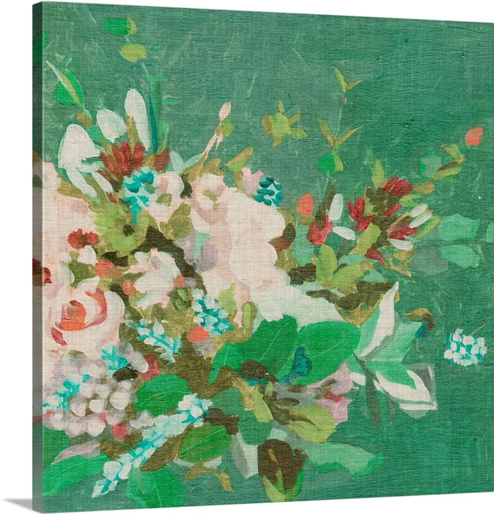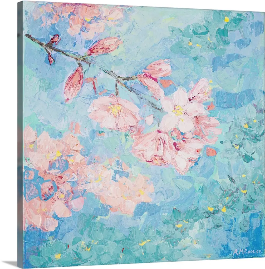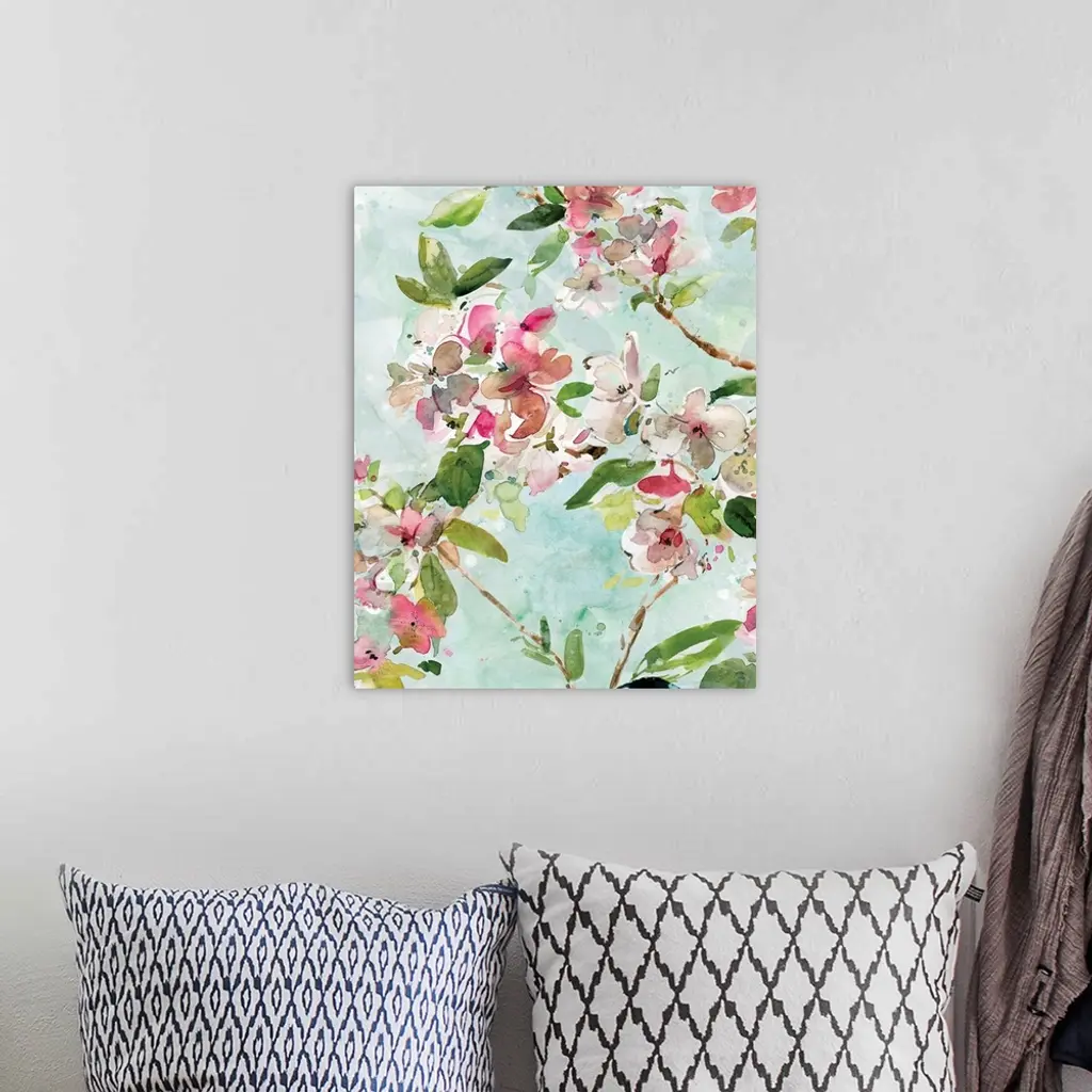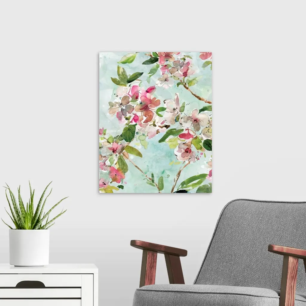 Watercolor painting of branches with pink and white flowers and bright green leaves on a light blue background.