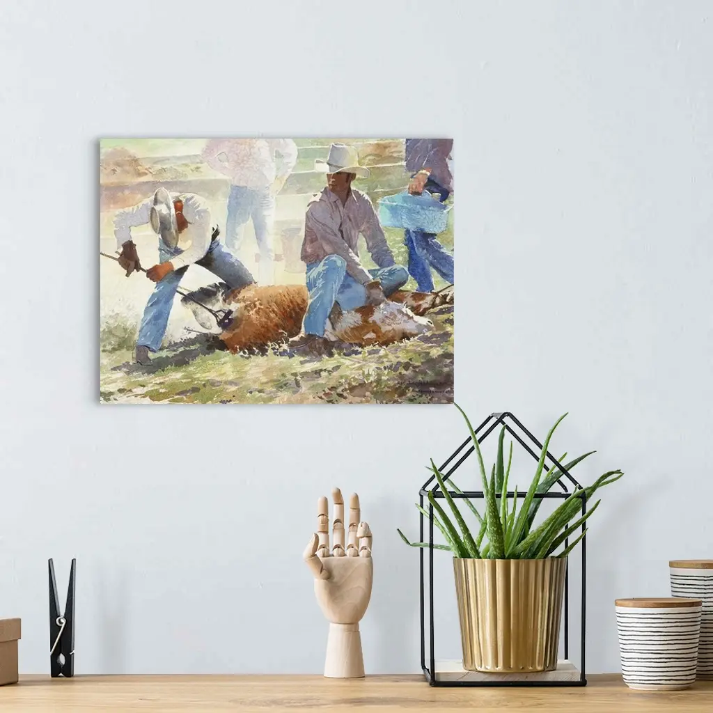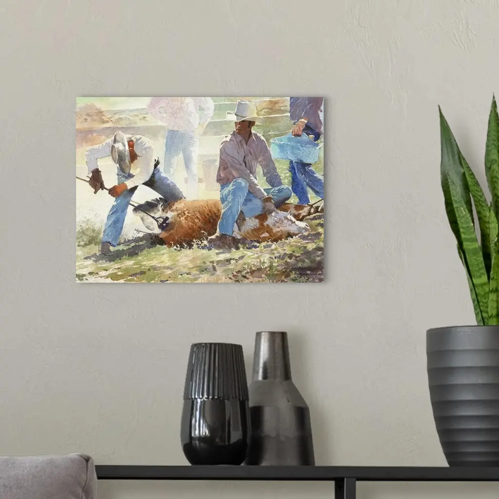 "Spring Branding" is a watercolor of cattle being branded during a spring roundup in California. The artist told me that this painting, and "Splitting the herd" were from a real california round up. It measures 30" X 23". It is undated, but the date may be similiar to the l981 date of the other paintings in this series. LaVere Hutchings spent much of his time in Idaho before moving to Los Angeles, then on to Jamestown California where he painted until his death in l999. He is a member of the National Watercolor Society, and author of several books, including "Make your watercolors sing" by Northlight..