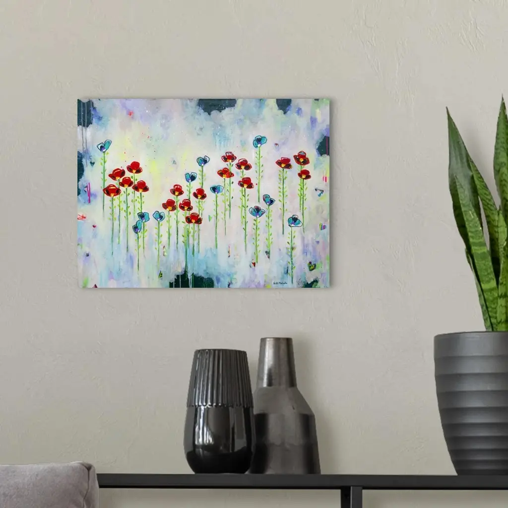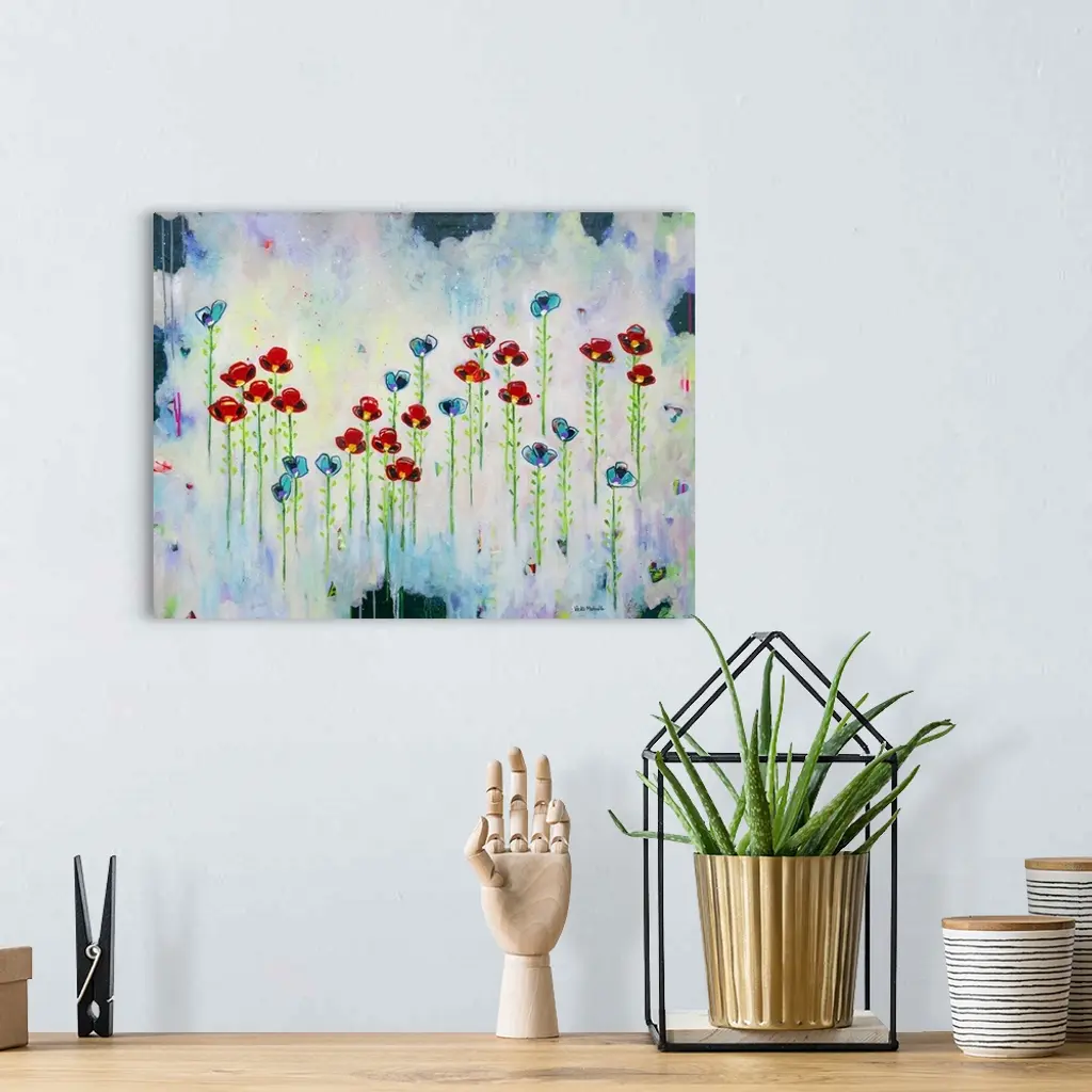Vibrant abstract painting with blue and red flowers that appear to be floating with long green stems and leaves on a colorful background.