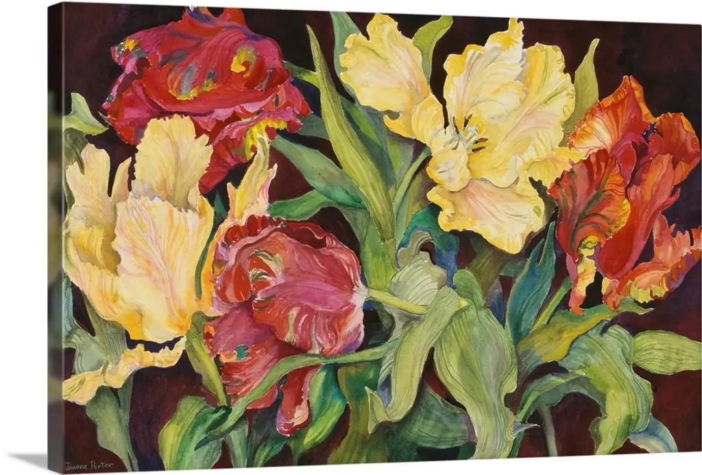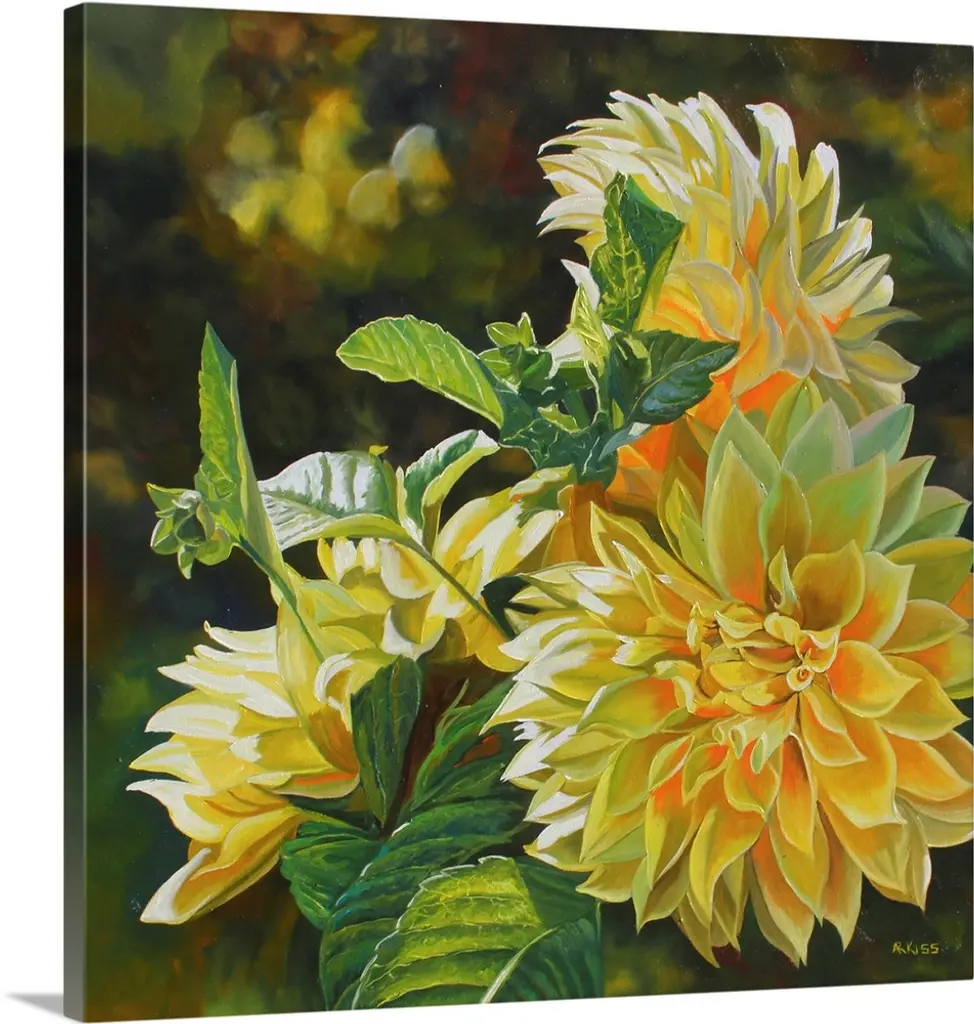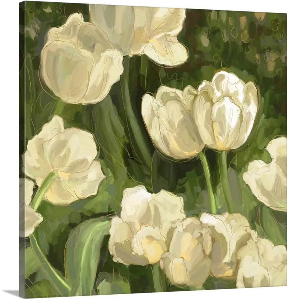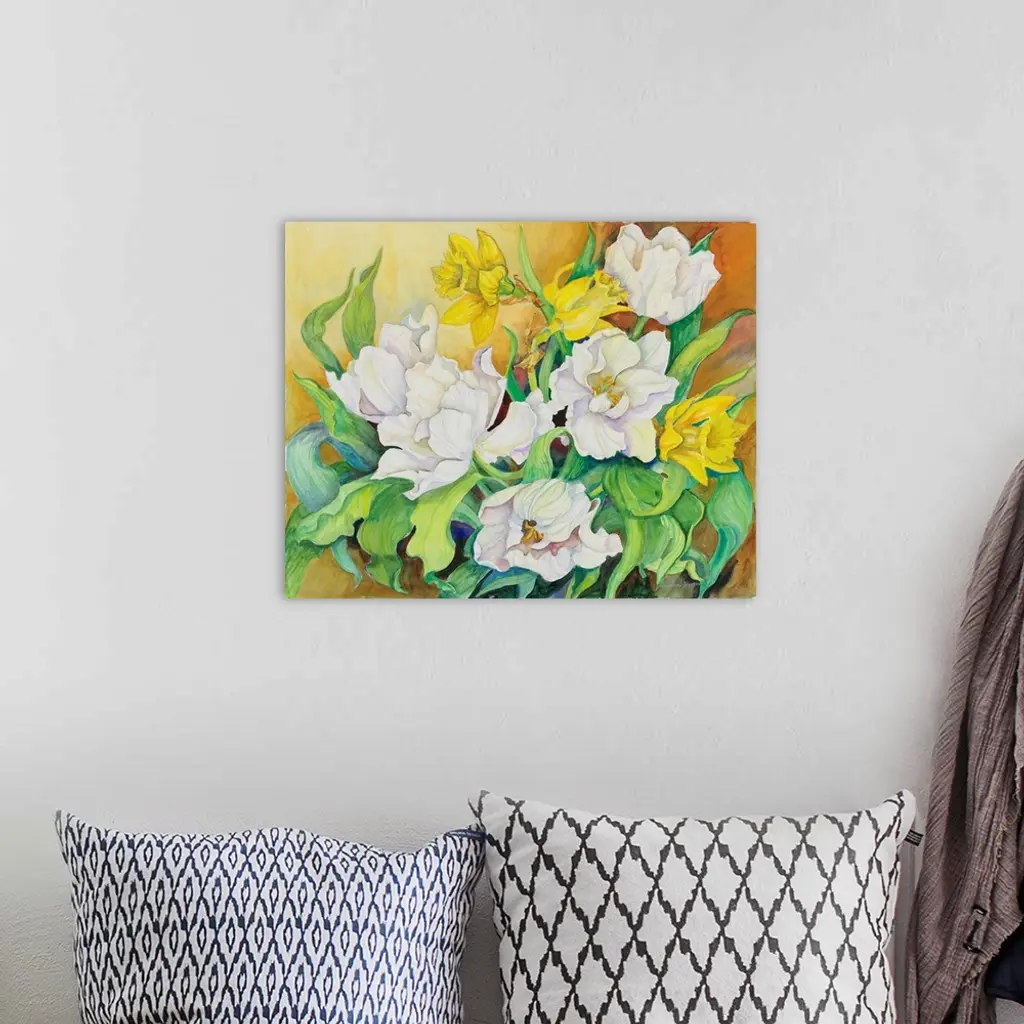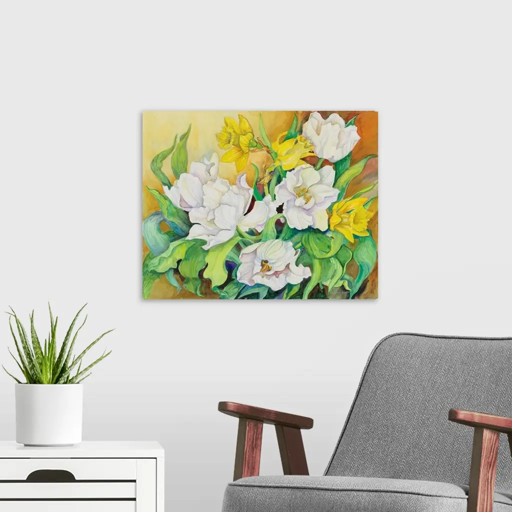Colorful contemporary painting of white and yellow flowers.