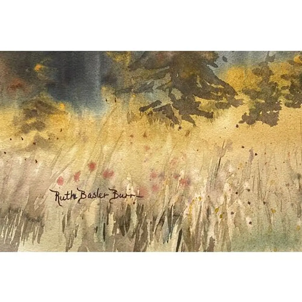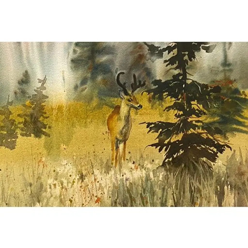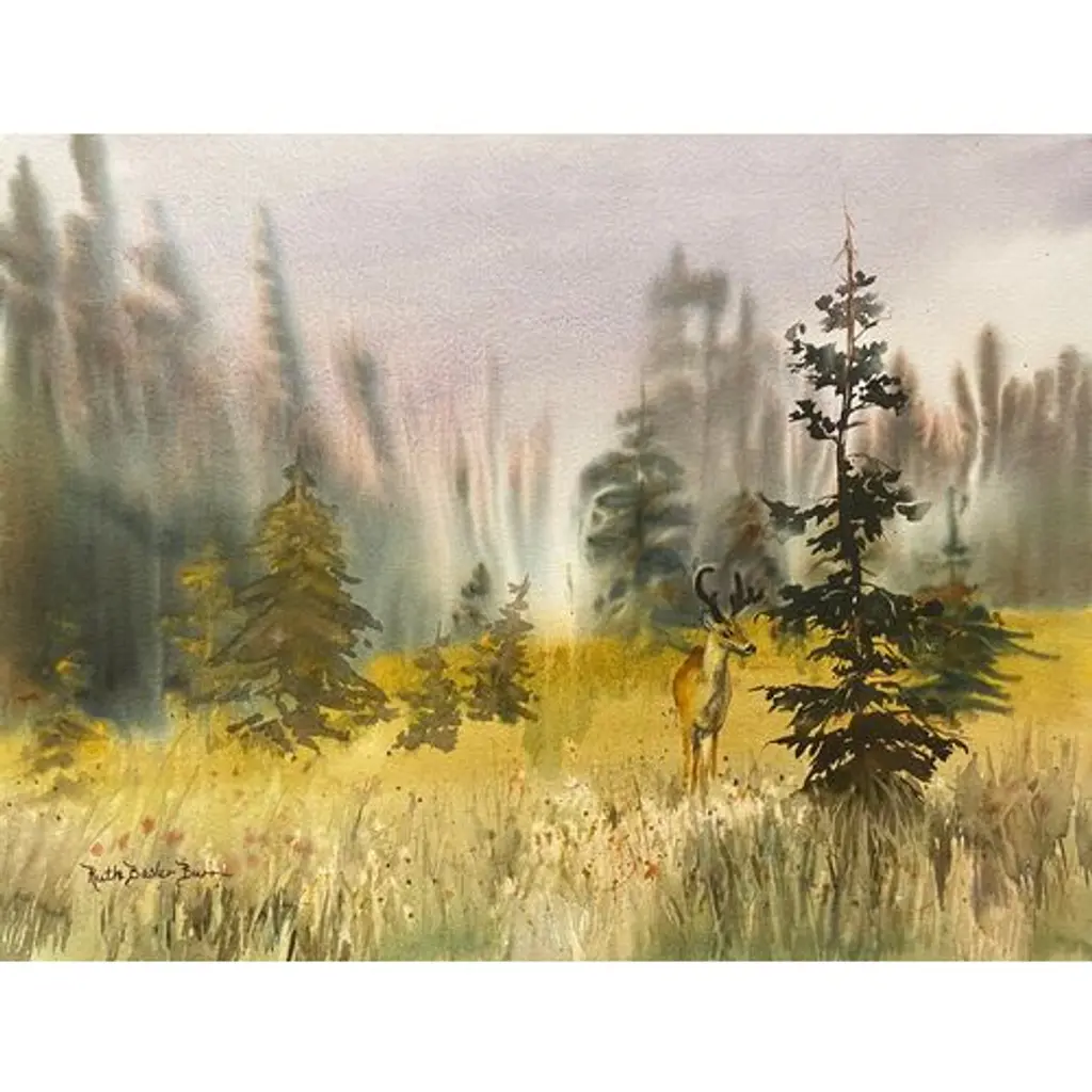 A bright and substantial watercolor landscape showing a young deer with moss-covered antlers standing in a clearing. Signed, lower left, Ruth Basler Burr (American, born 1934), a listed artist, and painted circa 1975. This San Juan Capistrano artist received her education at Glendale and Pierce colleges and teaching credential at UCLA. She has exhibited widely and with success at over sixty one-woman shows and taught art for many years at the Brand Art Center in Glendale, California.