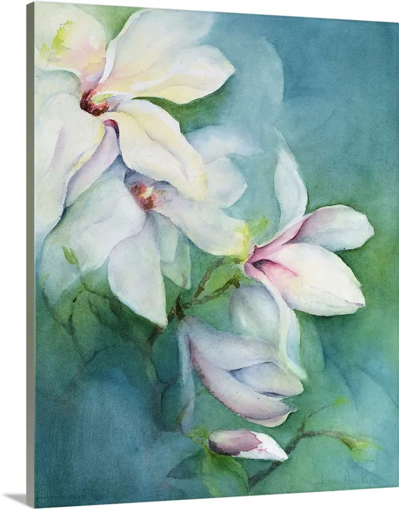 Large painting of flowers and stems in cool tones.
