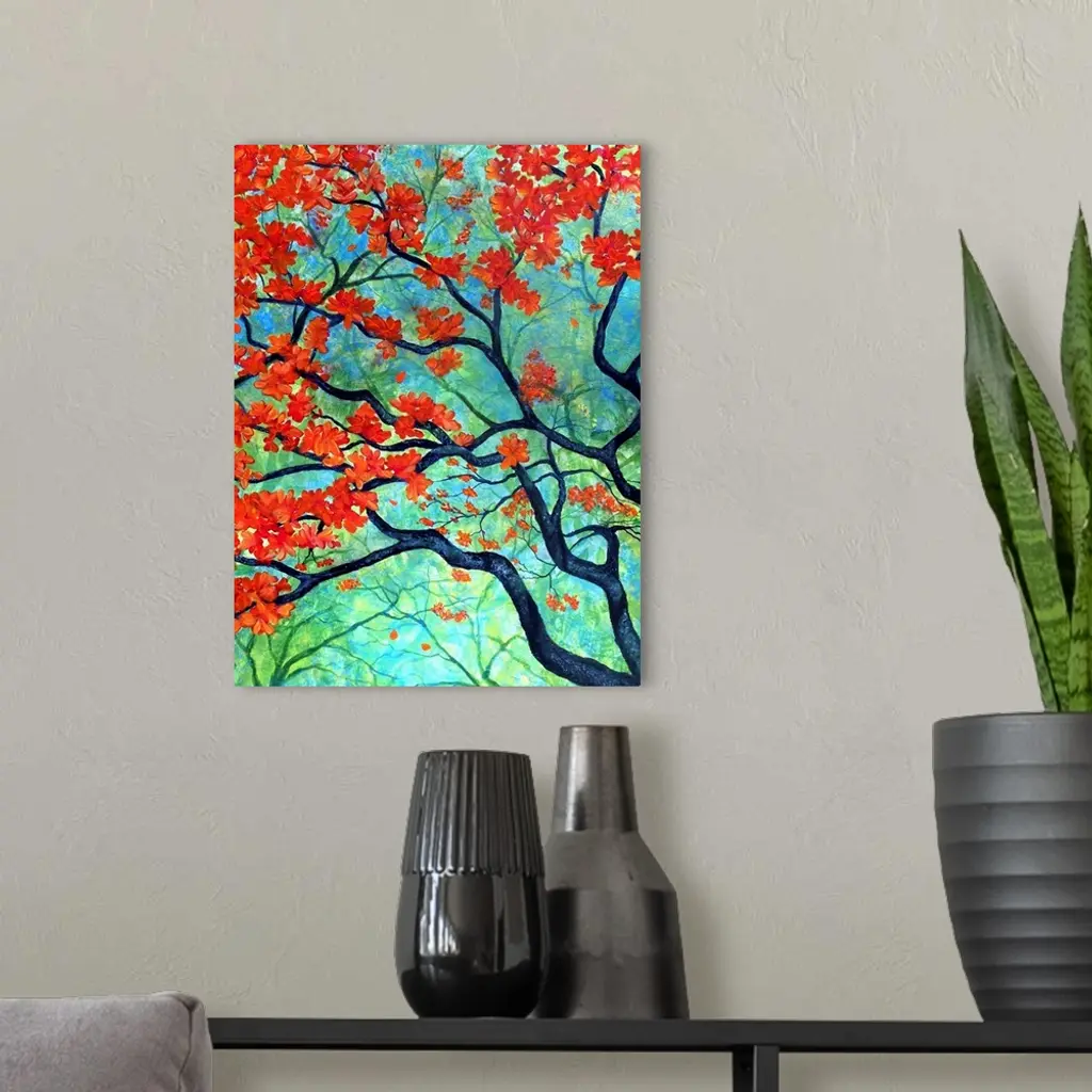 Contemporary painting of a tree top with orange and red leaves on a blue and green background.