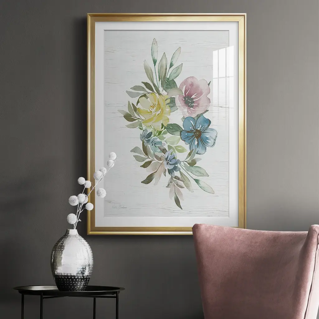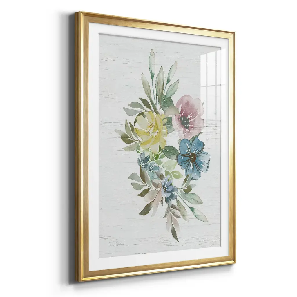 Spring Meadow Arrangement I Premium Framed Print - Ready to Hang A Premium Framed Print created to last. Framed in distressed wood and available in an array of sizes and colors Featuring a beveled a solid wood stretcher bar, each piece comes ready to hand 4 SIZES AVAILABLE 30.5''X42.5'' - Overall Size 26.5'X36.5'' - Overall Size 22.5''x30.5'' - Overall Size 18.5''x24.5'' - Overall Size Each piece is made to order. Each piece comes with hanging hardware. Made in the USA Ready to Hang Giclee Paper Print Acrylic Glass Beveled Matt Board