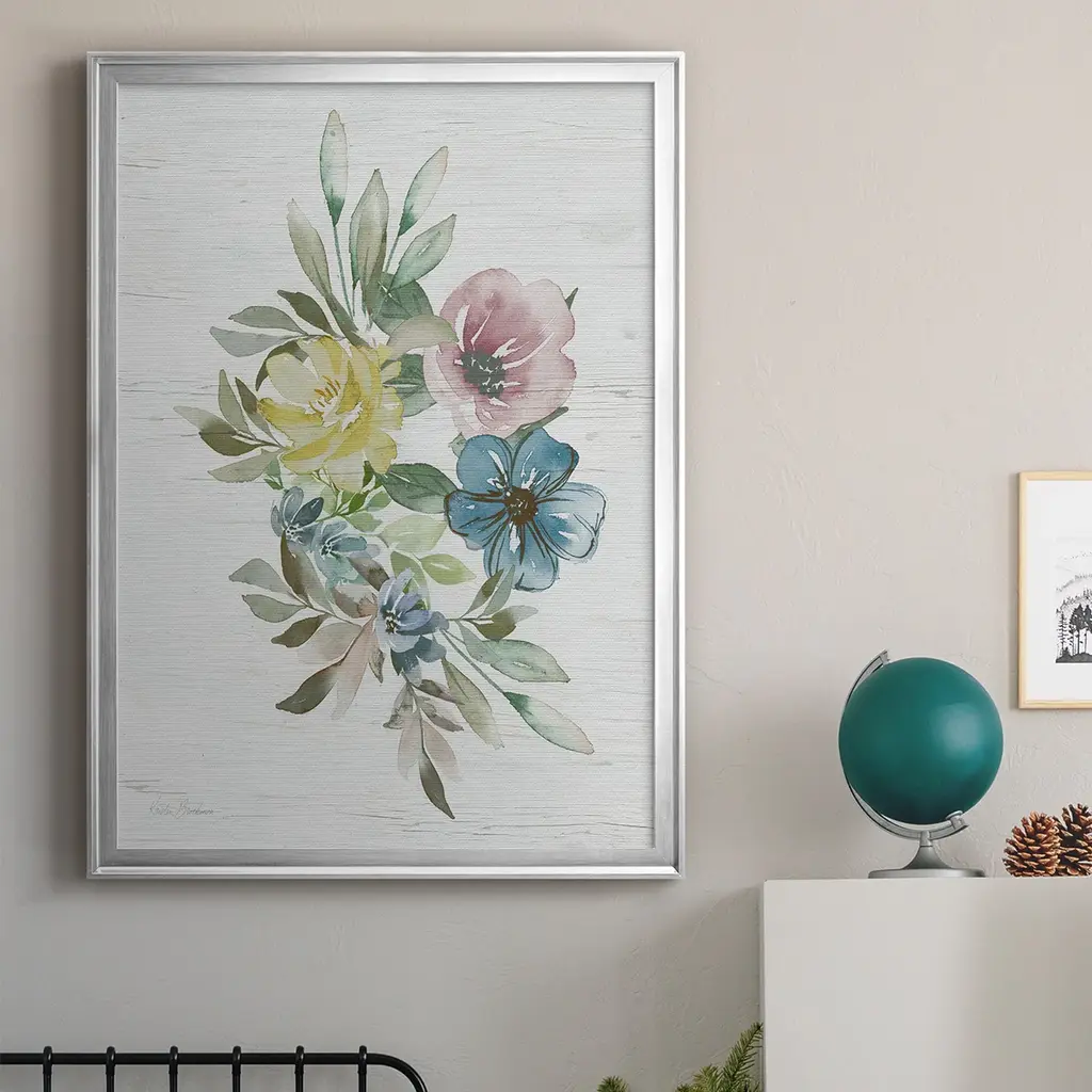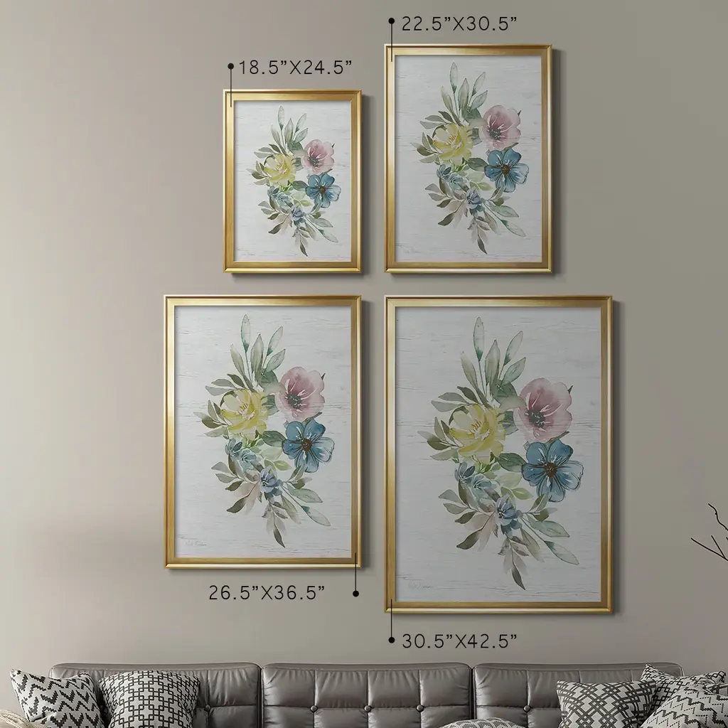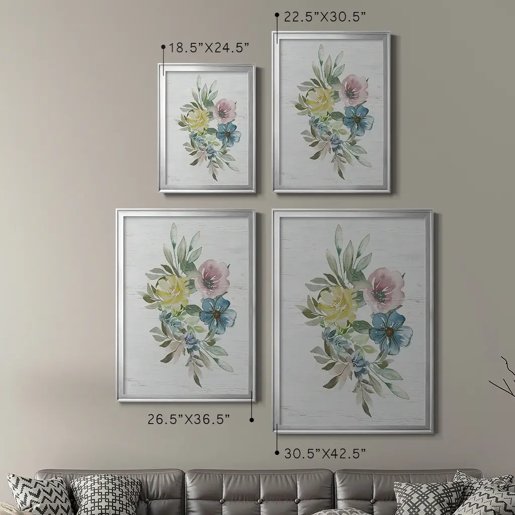 Spring Meadow Arrangement I Premium Framed Print - Ready to Hang A Premium Framed Print created to last. Framed in distressed wood and available in an array of sizes and colors Featuring a beveled a solid wood stretcher bar, each piece comes ready to hand 4 SIZES AVAILABLE 30.5''X42.5'' - Overall Size 26.5'X36.5'' - Overall Size 22.5''x30.5'' - Overall Size 18.5''x24.5'' - Overall Size Each piece is made to order. Each piece comes with hanging hardware. Made in the USA Ready to Hang