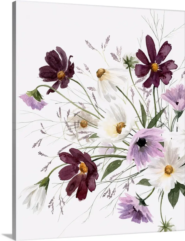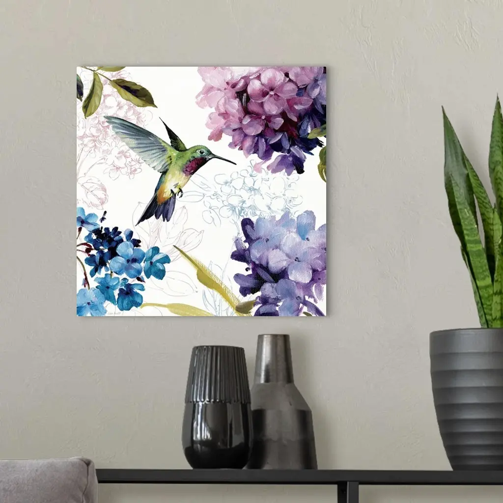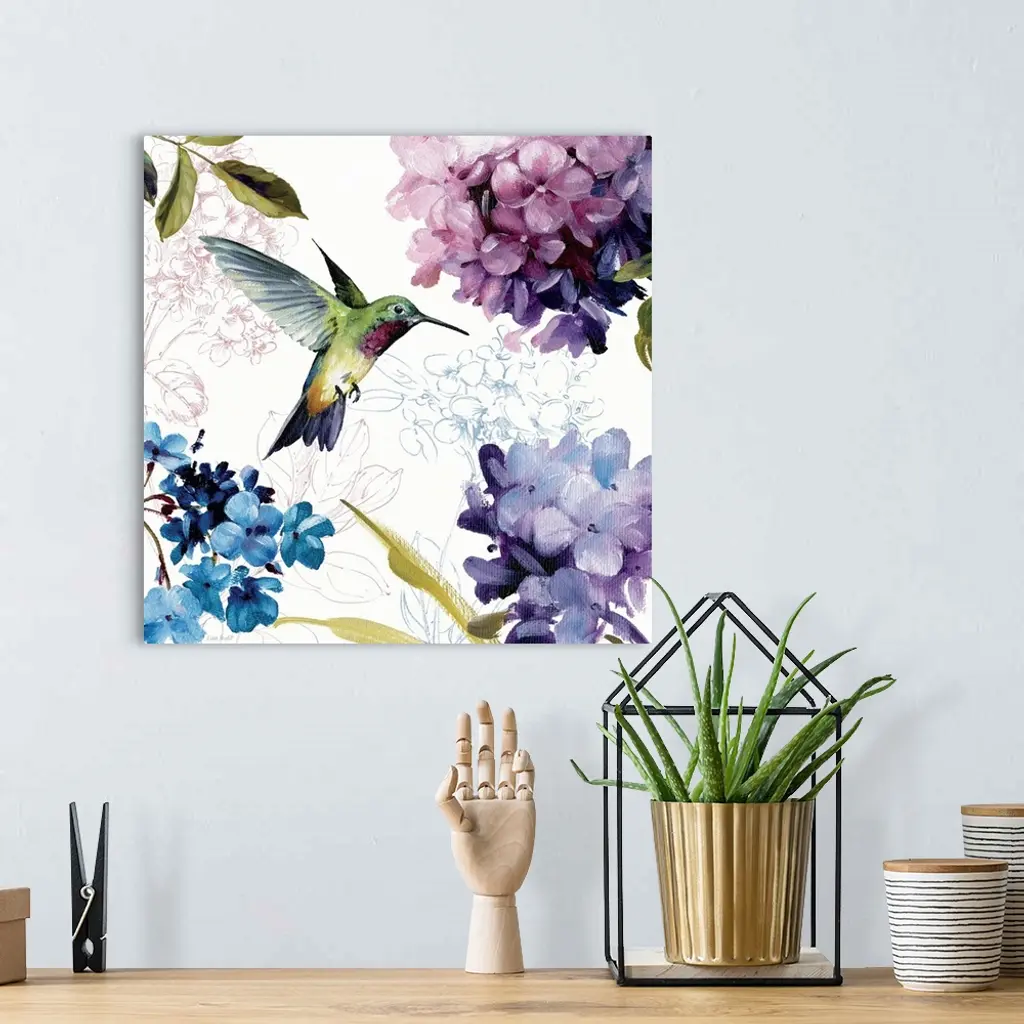 Home docor painting of a hummingbird in flight surrounded by hydrangea flower blooms.