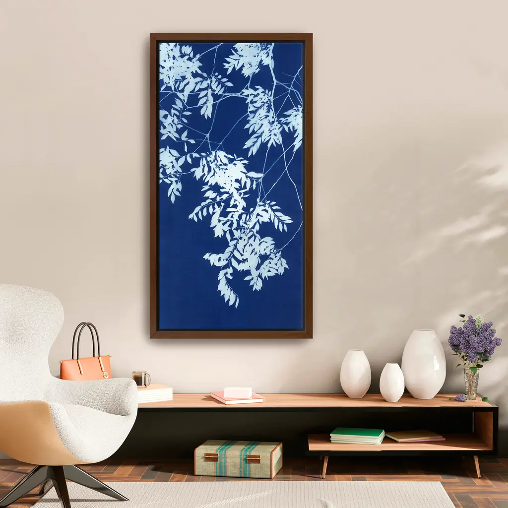 This striking artwork captures a moment of suspended stillness, where feathery leaves and winding stems float across a velvet-like navy canvas. Its minimalist composition and calming tones make it an ideal statement piece for lovers of modern nature-inspired art. Our Gallery Wrap Canvas Prints are proudly assembled with high quality materials in California, USA. Each piece is printed on a thick, archival grade canvas using Giclee technology. It is then hand-stretched by our experienced artisans over solid wood bars, which will not warp over time. The final product is a piece personally crafted for you to confidently display on your wall. Care and Assembly: Ensure that the location of your piece has little to no exposure to heat, sunlight, and moisture. Wipe clean, only if needed. Each piece includes hanging hardware to hang on your wall vertically.