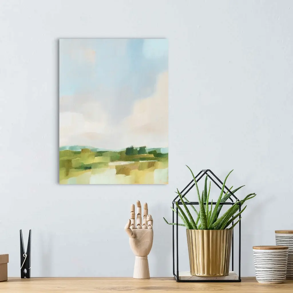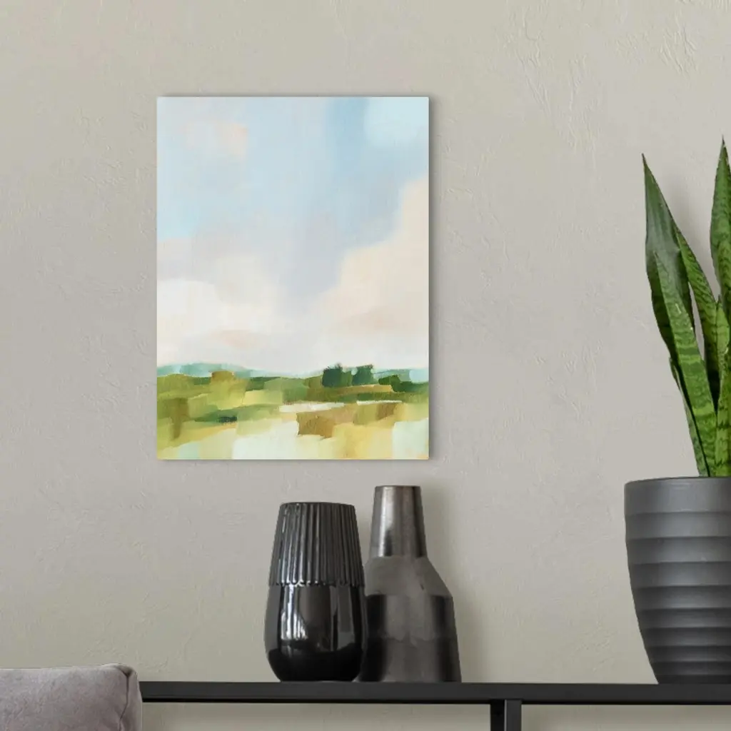 Contemporary abstract painting highlighting a pale blue sky over a green landscape.
