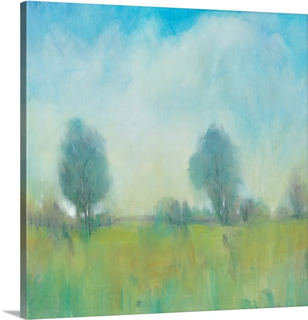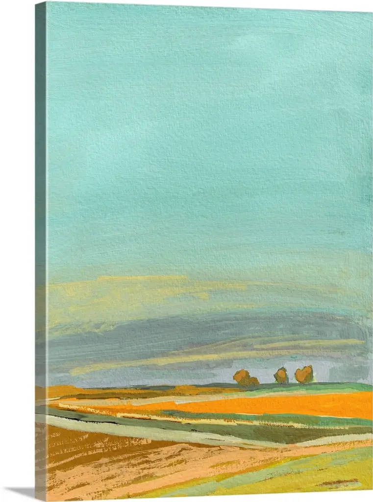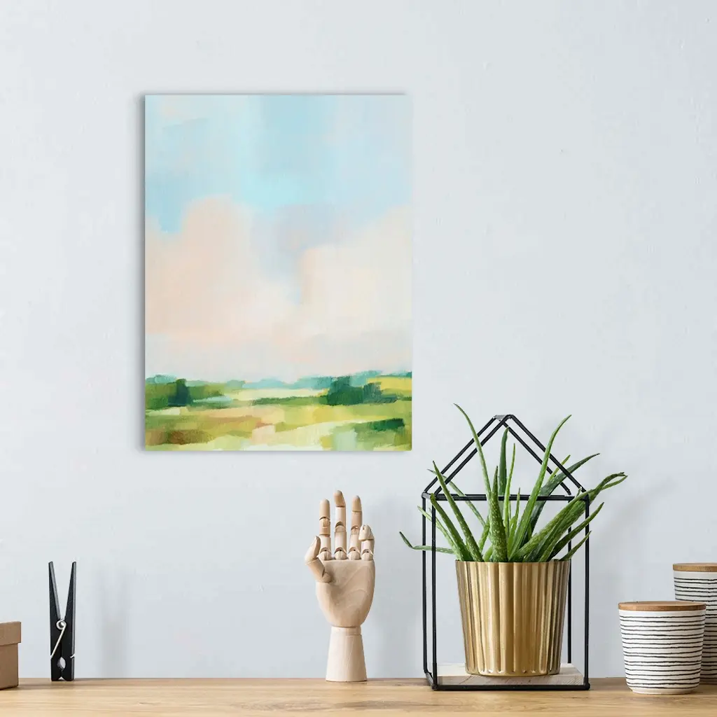 Contemporary abstract painting highlighting a pale blue sky over a green landscape.