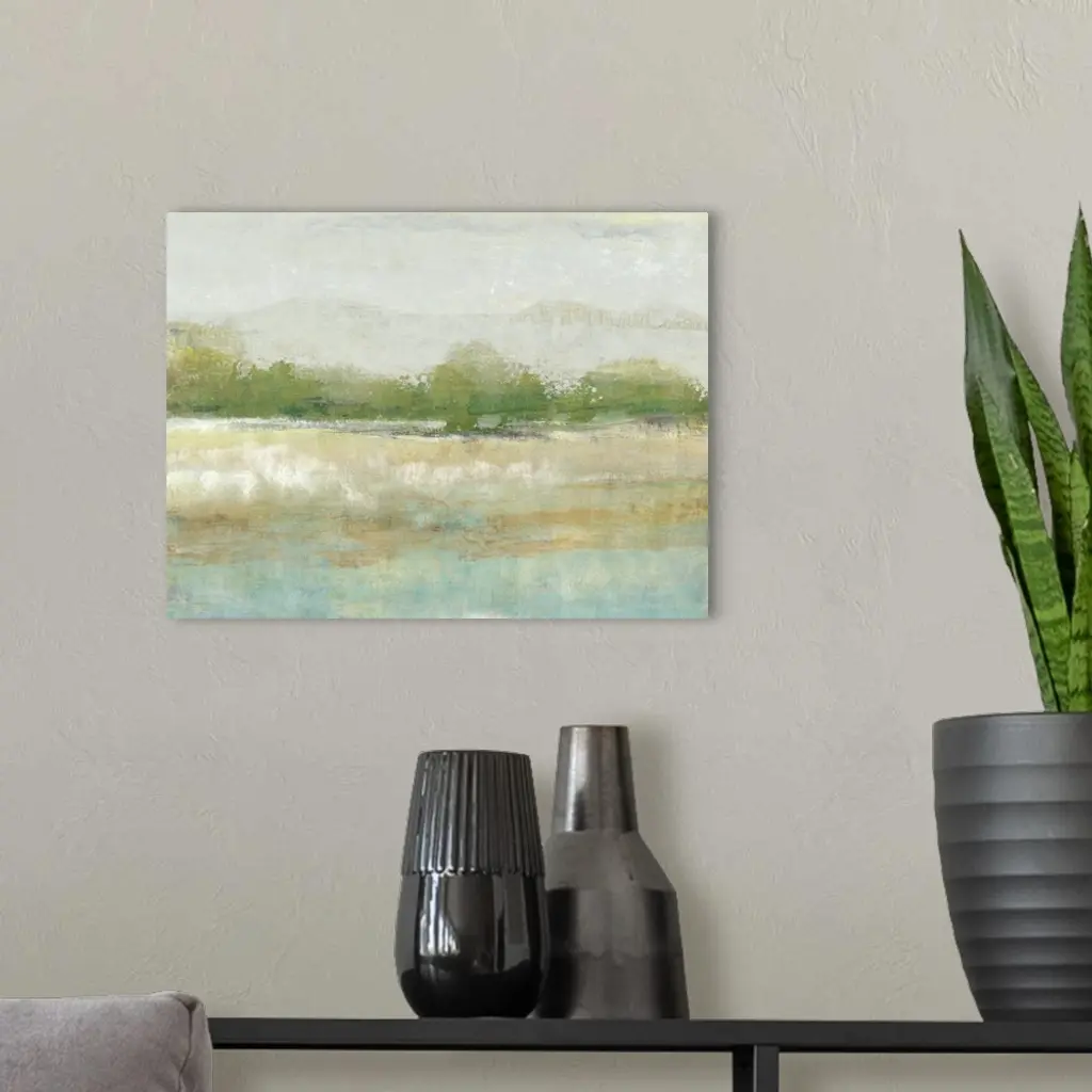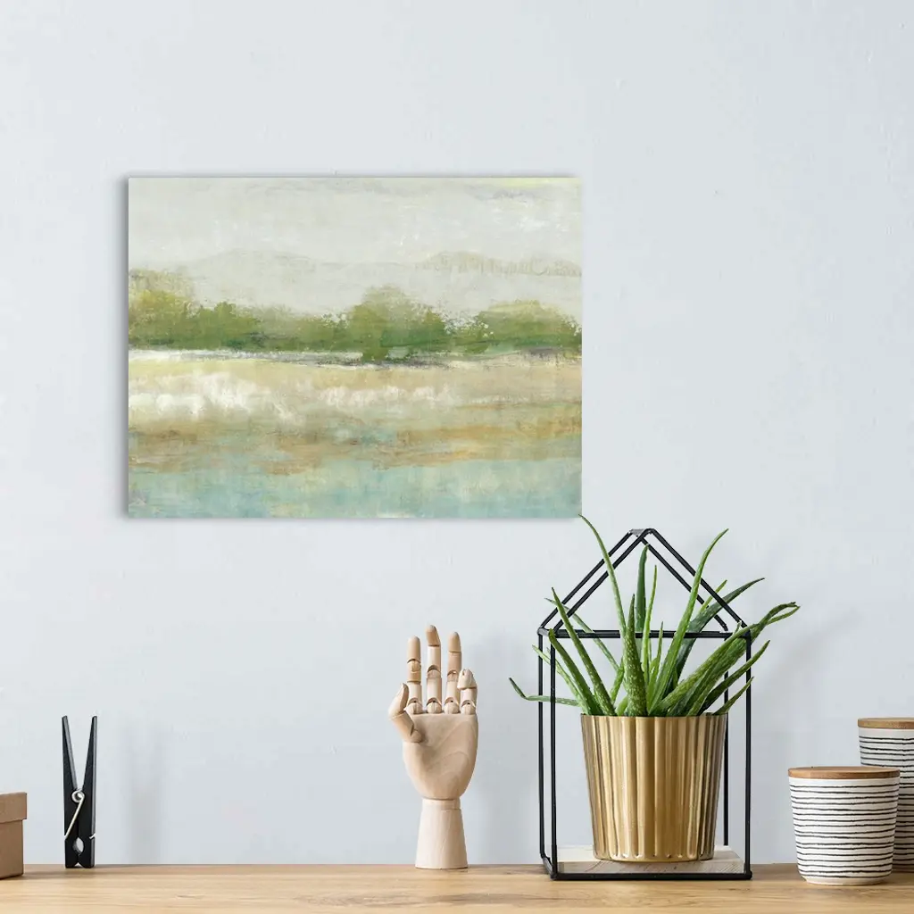Contemporary landscape painting of a meadow with green trees along the edge.