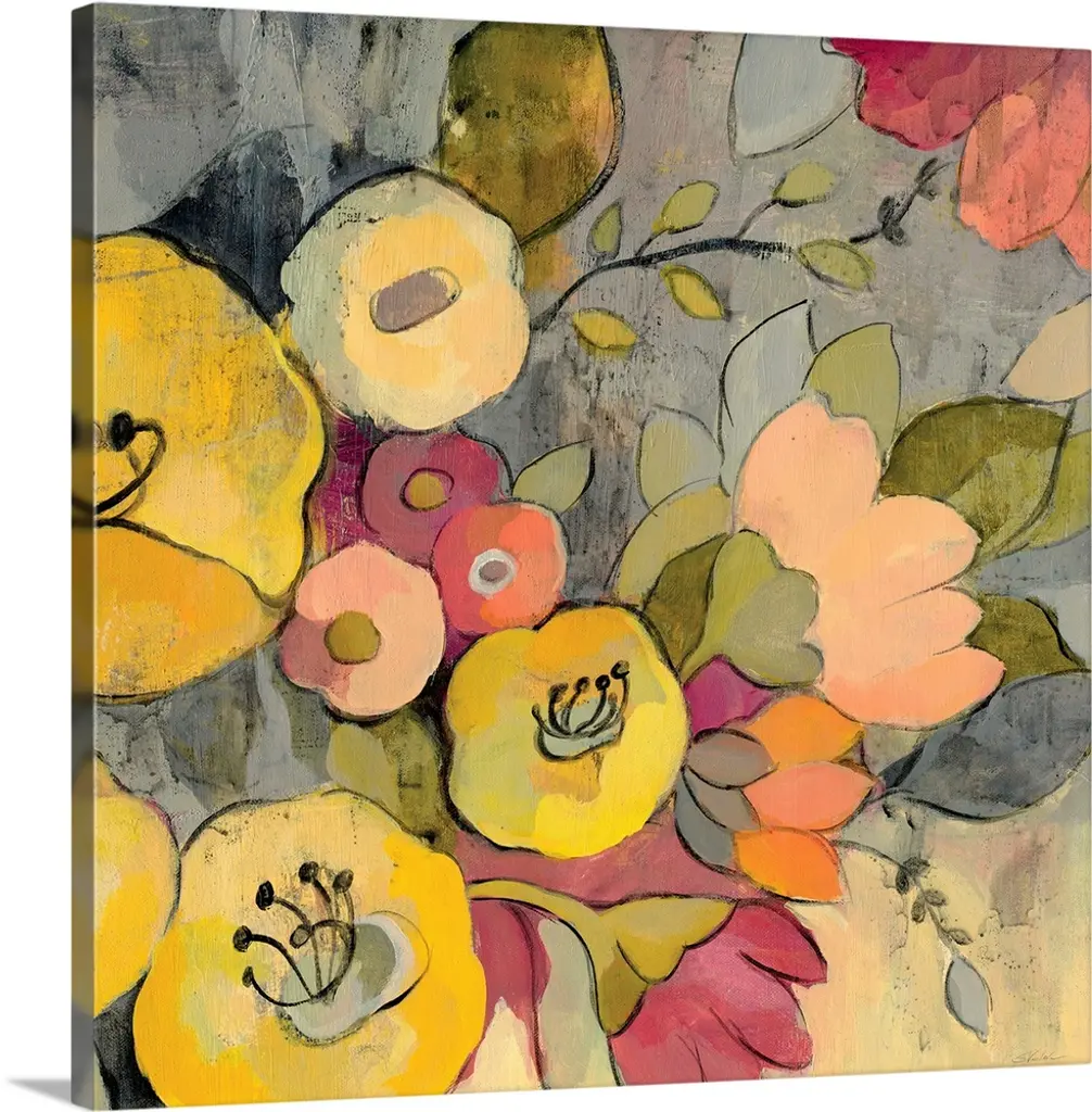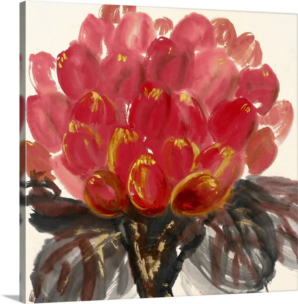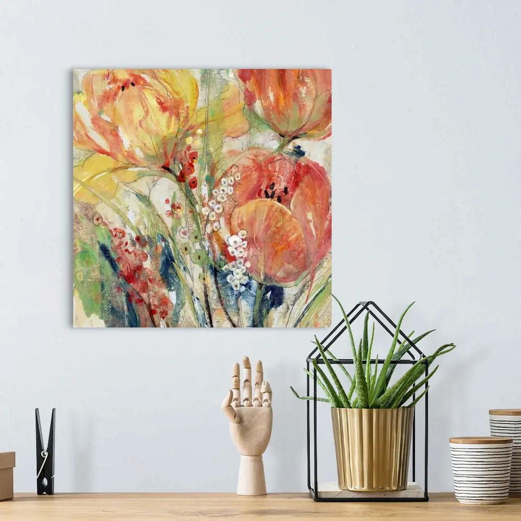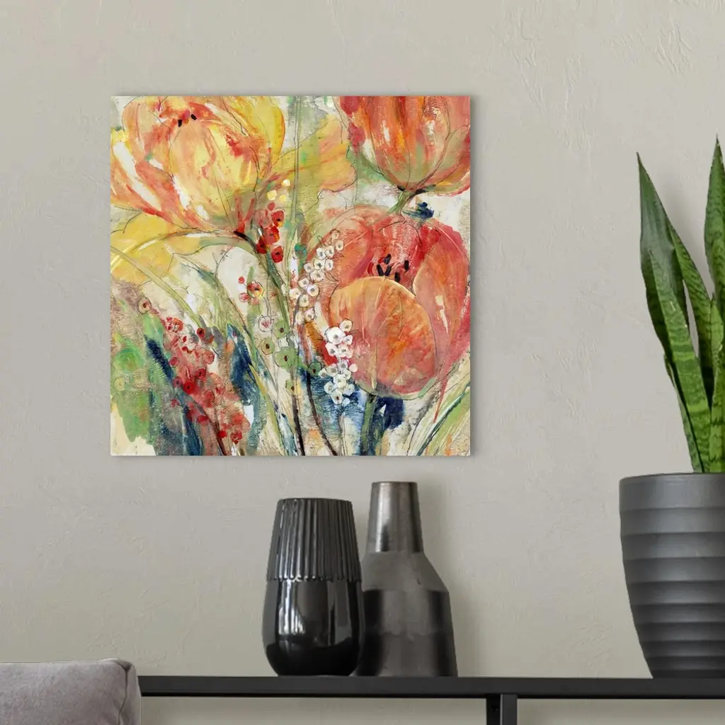 Contemporary abstract painting of orange and yellow tulips blooming in spring.