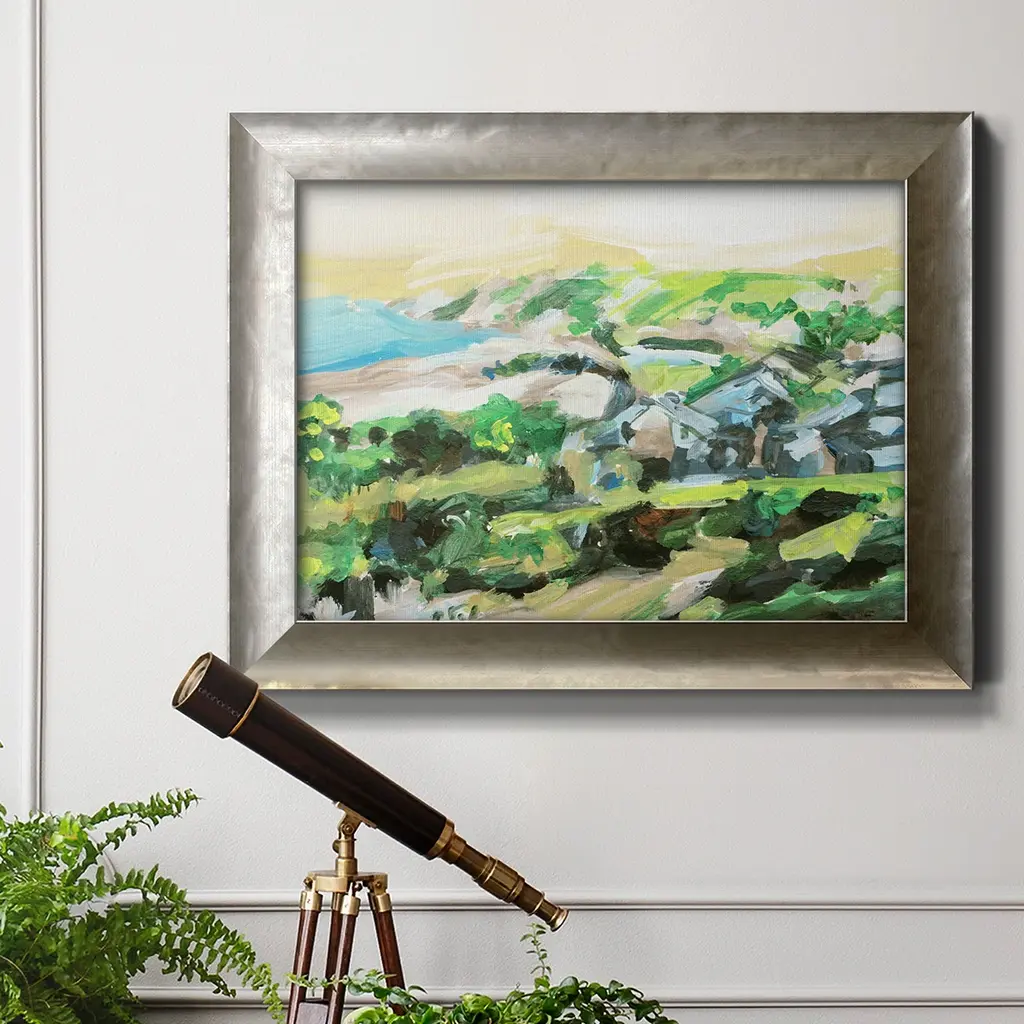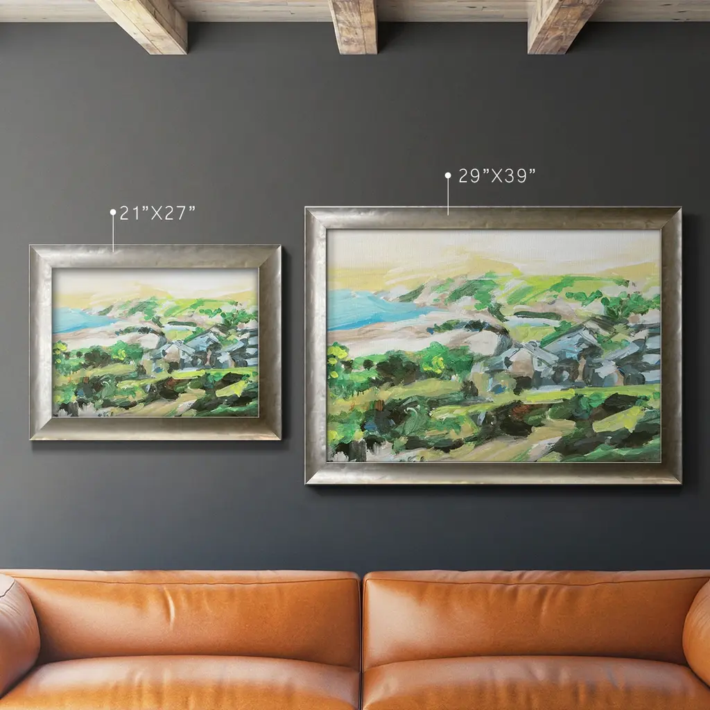 Spring Village I Premium Framed Canvas- Ready to Hang A Premium Framed Canvas created to last. Framed in distressed wood and available in an array of sizes and colors Featuring a beveled a solid wood stretcher bar, each piece comes ready to hand 3 SIZES AVAILABLE 16''X20'' - Overall Size 18'X27'' - Overall Size 24''x36'' - Overall Size Each piece is made to order. Each piece comes with hanging hardware. Made in the USA Ready to Hang Giclee Paper Print Acrylic Glass Beveled Matt Board