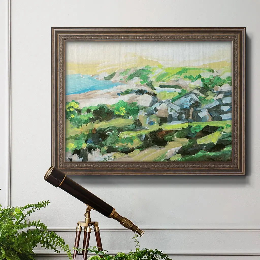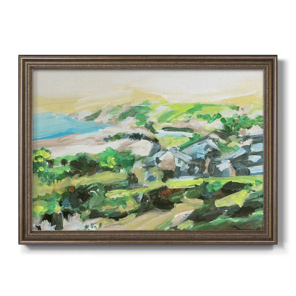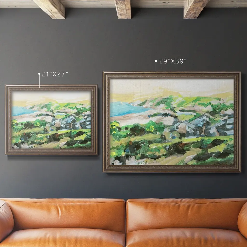 Spring Village I Premium Framed Canvas- Ready to Hang A Premium Framed Canvas created to last. Framed in distressed wood and available in an array of sizes and colors Featuring a beveled a solid wood stretcher bar, each piece comes ready to hand 3 SIZES AVAILABLE 16''X20'' - Overall Size 18'X27'' - Overall Size 24''x36'' - Overall Size Each piece is made to order. Each piece comes with hanging hardware. Made in the USA Ready to Hang Giclee Paper Print Acrylic Glass Beveled Matt Board