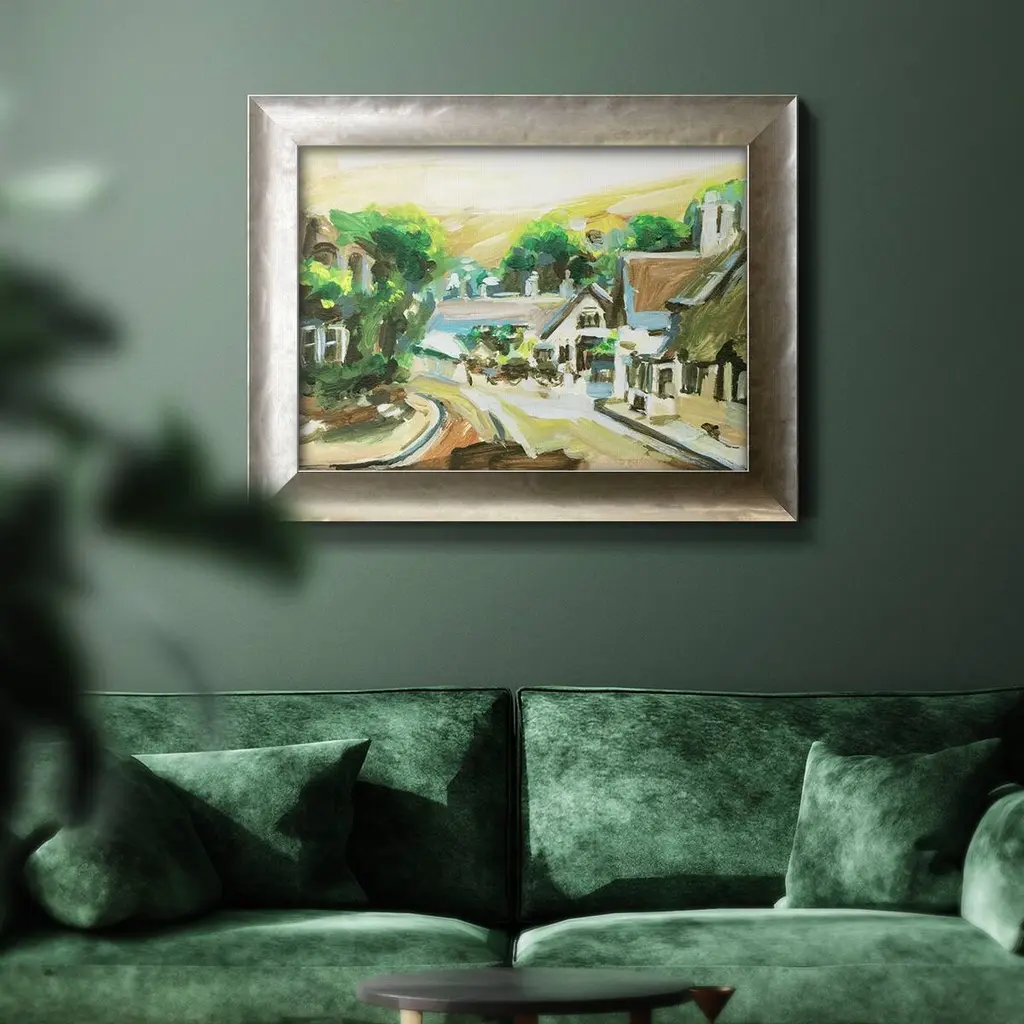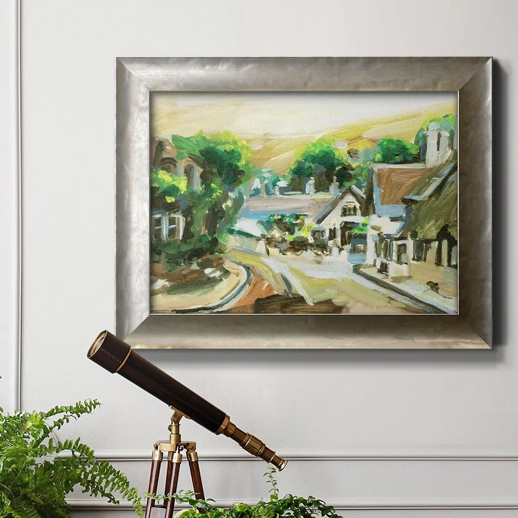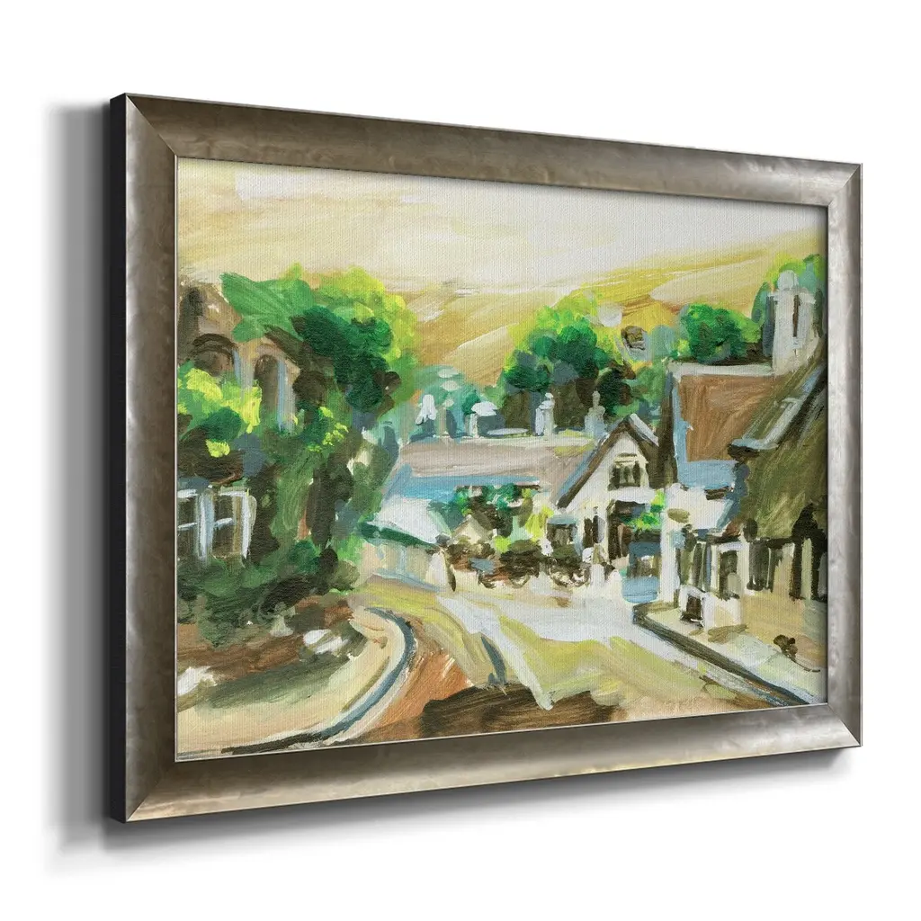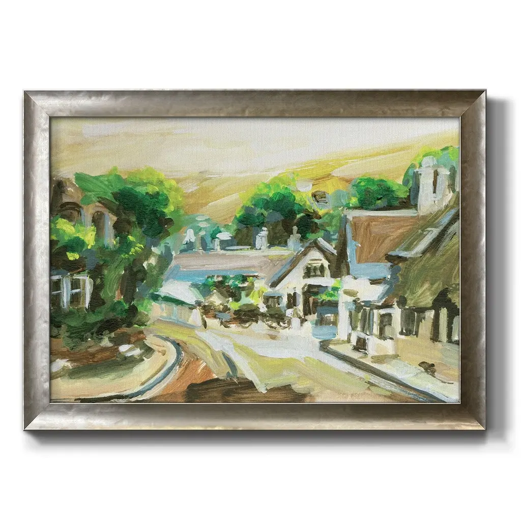 Spring Village II Premium Framed Canvas- Ready to Hang A Premium Framed Canvas created to last. Framed in distressed wood and available in an array of sizes and colors Featuring a beveled a solid wood stretcher bar, each piece comes ready to hand 3 SIZES AVAILABLE 16''X20'' - Overall Size 18'X27'' - Overall Size 24''x36'' - Overall Size Each piece is made to order. Each piece comes with hanging hardware. Made in the USA Ready to Hang Giclee Paper Print Acrylic Glass Beveled Matt Board
