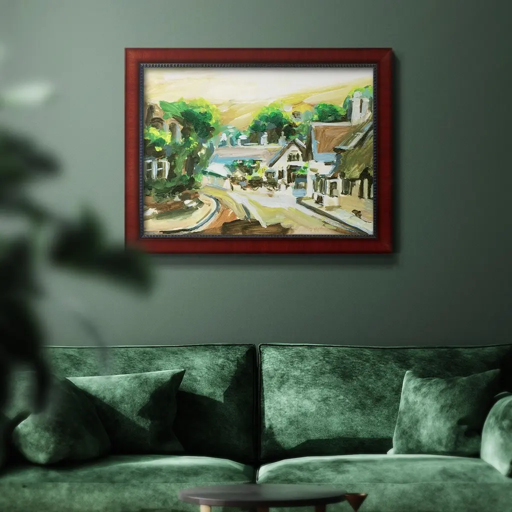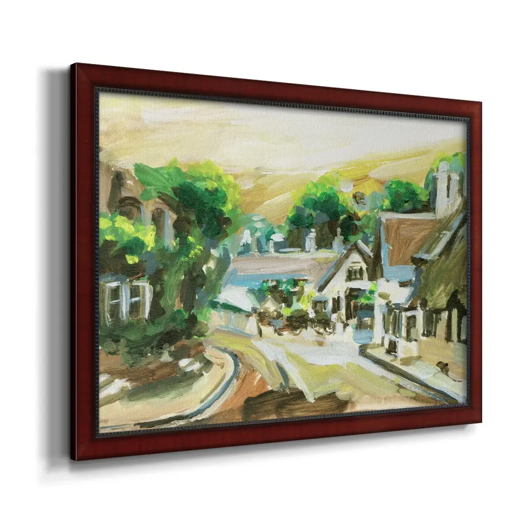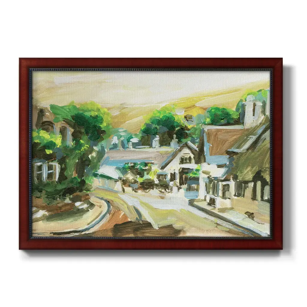 Spring Village II Premium Framed Canvas- Ready to Hang A Premium Framed Canvas created to last. Framed in distressed wood and available in an array of sizes and colors Featuring a beveled a solid wood stretcher bar, each piece comes ready to hand 3 SIZES AVAILABLE 16''X20'' - Overall Size 18'X27'' - Overall Size 24''x36'' - Overall Size Each piece is made to order. Each piece comes with hanging hardware. Made in the USA Ready to Hang Giclee Paper Print Acrylic Glass Beveled Matt Board