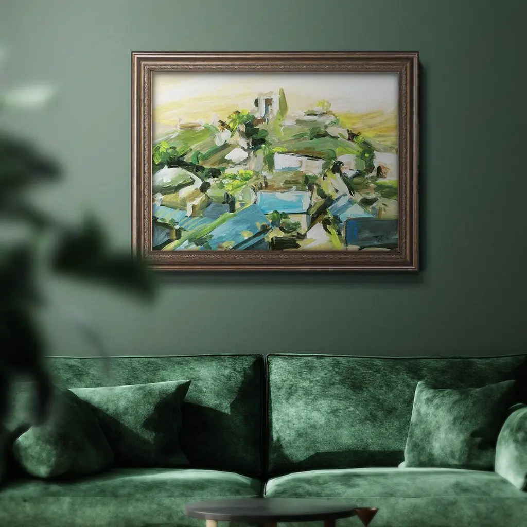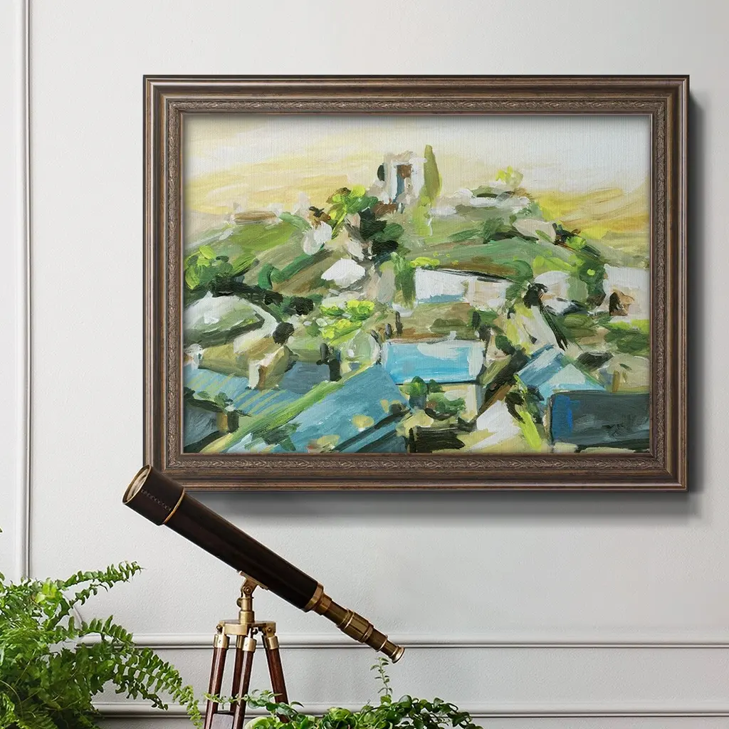 Spring Village III Premium Framed Canvas- Ready to Hang A Premium Framed Canvas created to last. Framed in distressed wood and available in an array of sizes and colors Featuring a beveled a solid wood stretcher bar, each piece comes ready to hand 3 SIZES AVAILABLE 16''X20'' - Overall Size 18'X27'' - Overall Size 24''x36'' - Overall Size Each piece is made to order. Each piece comes with hanging hardware. Made in the USA Ready to Hang Giclee Paper Print Acrylic Glass Beveled Matt Board