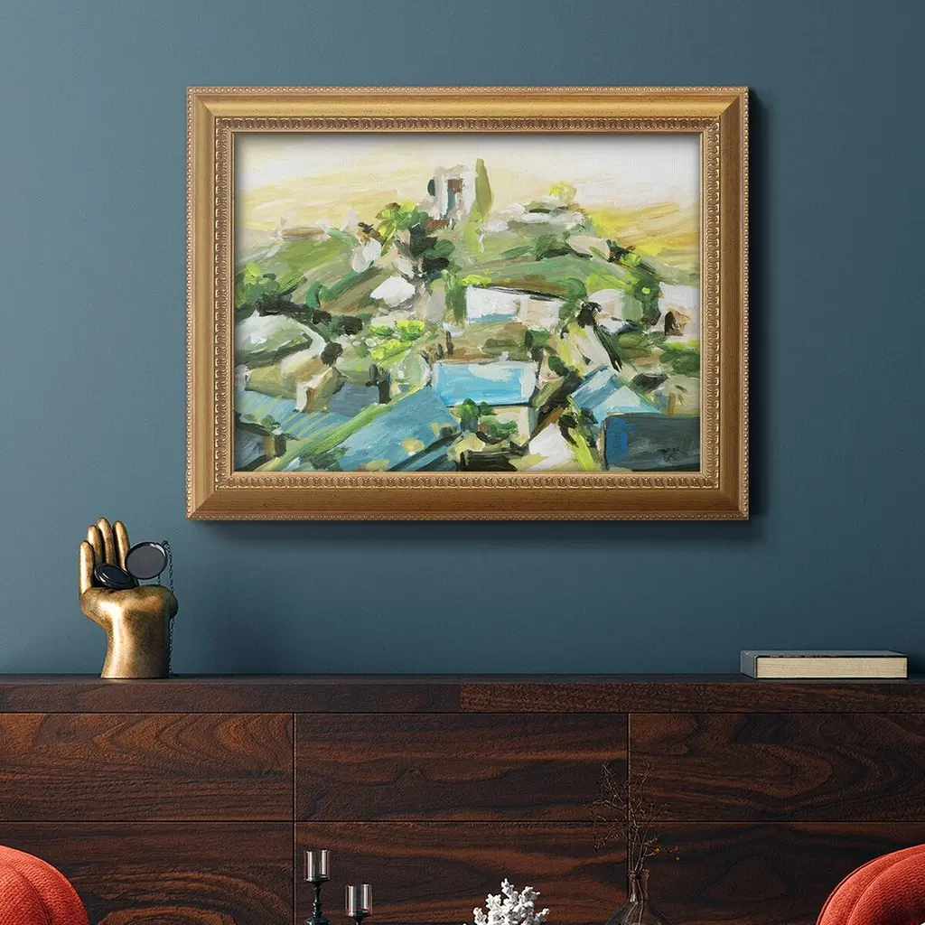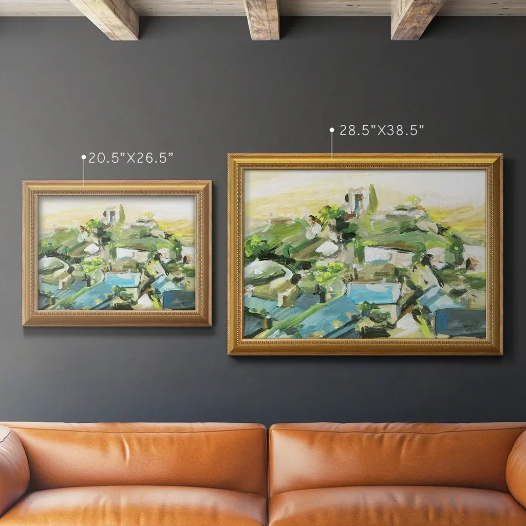Spring Village III Premium Framed Canvas- Ready to Hang A Premium Framed Canvas created to last. Framed in distressed wood and available in an array of sizes and colors Featuring a beveled a solid wood stretcher bar, each piece comes ready to hand 3 SIZES AVAILABLE 16''X20'' - Overall Size 18'X27'' - Overall Size 24''x36'' - Overall Size Each piece is made to order. Each piece comes with hanging hardware. Made in the USA Ready to Hang Giclee Paper Print Acrylic Glass Beveled Matt Board