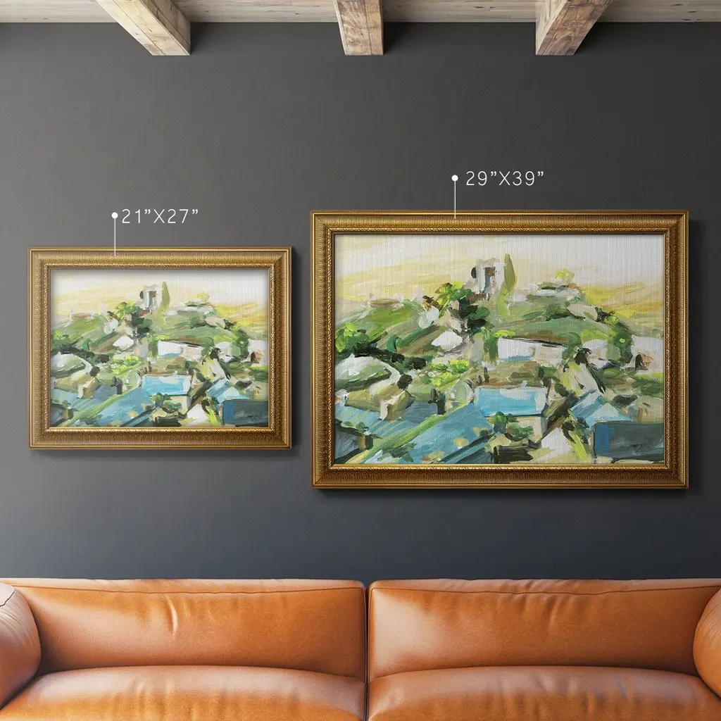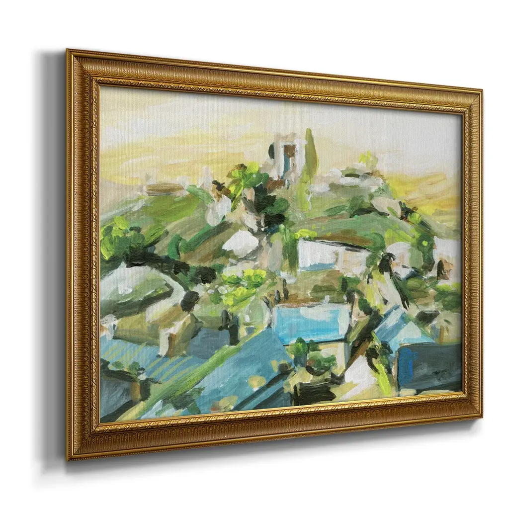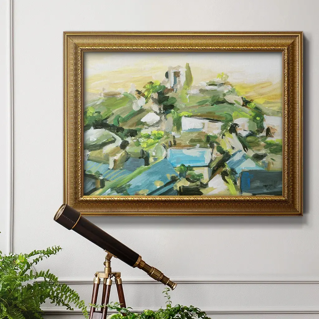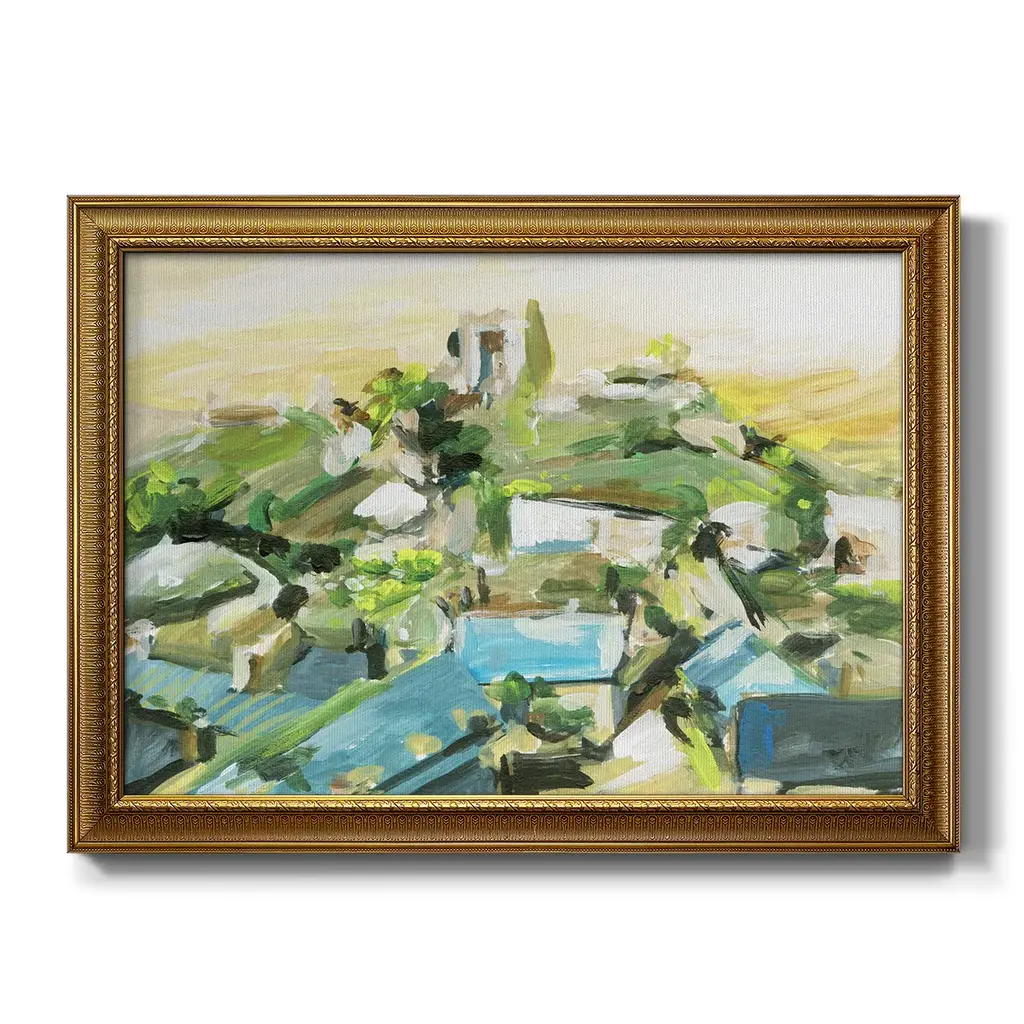 Spring Village III Premium Framed Canvas- Ready to Hang A Premium Framed Canvas created to last. Framed in distressed wood and available in an array of sizes and colors Featuring a beveled a solid wood stretcher bar, each piece comes ready to hand 3 SIZES AVAILABLE 16''X20'' - Overall Size 18'X27'' - Overall Size 24''x36'' - Overall Size Each piece is made to order. Each piece comes with hanging hardware. Made in the USA Ready to Hang Giclee Paper Print Acrylic Glass Beveled Matt Board
