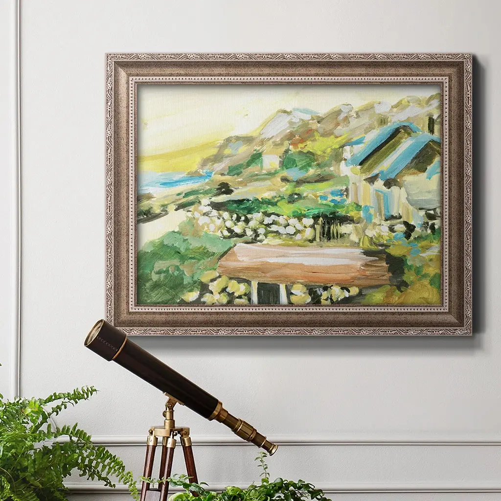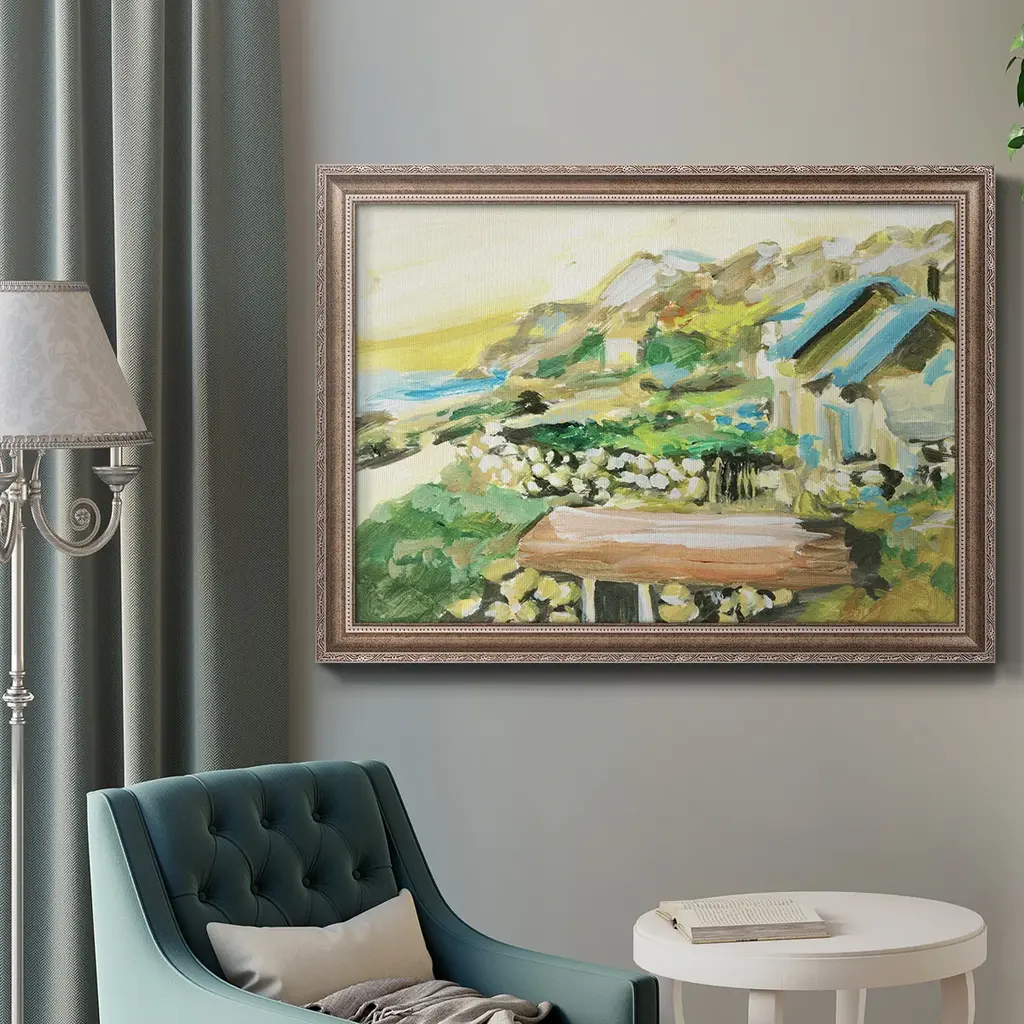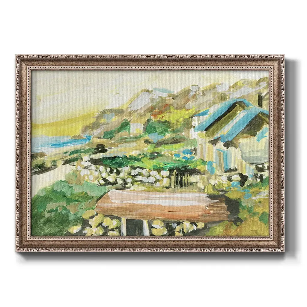Spring Village IV Premium Framed Canvas- Ready to Hang A Premium Framed Canvas created to last. Framed in distressed wood and available in an array of sizes and colors Featuring a beveled a solid wood stretcher bar, each piece comes ready to hand 3 SIZES AVAILABLE 16''X20'' - Overall Size 18'X27'' - Overall Size 24''x36'' - Overall Size Each piece is made to order. Each piece comes with hanging hardware. Made in the USA Ready to Hang Giclee Paper Print Acrylic Glass Beveled Matt Board