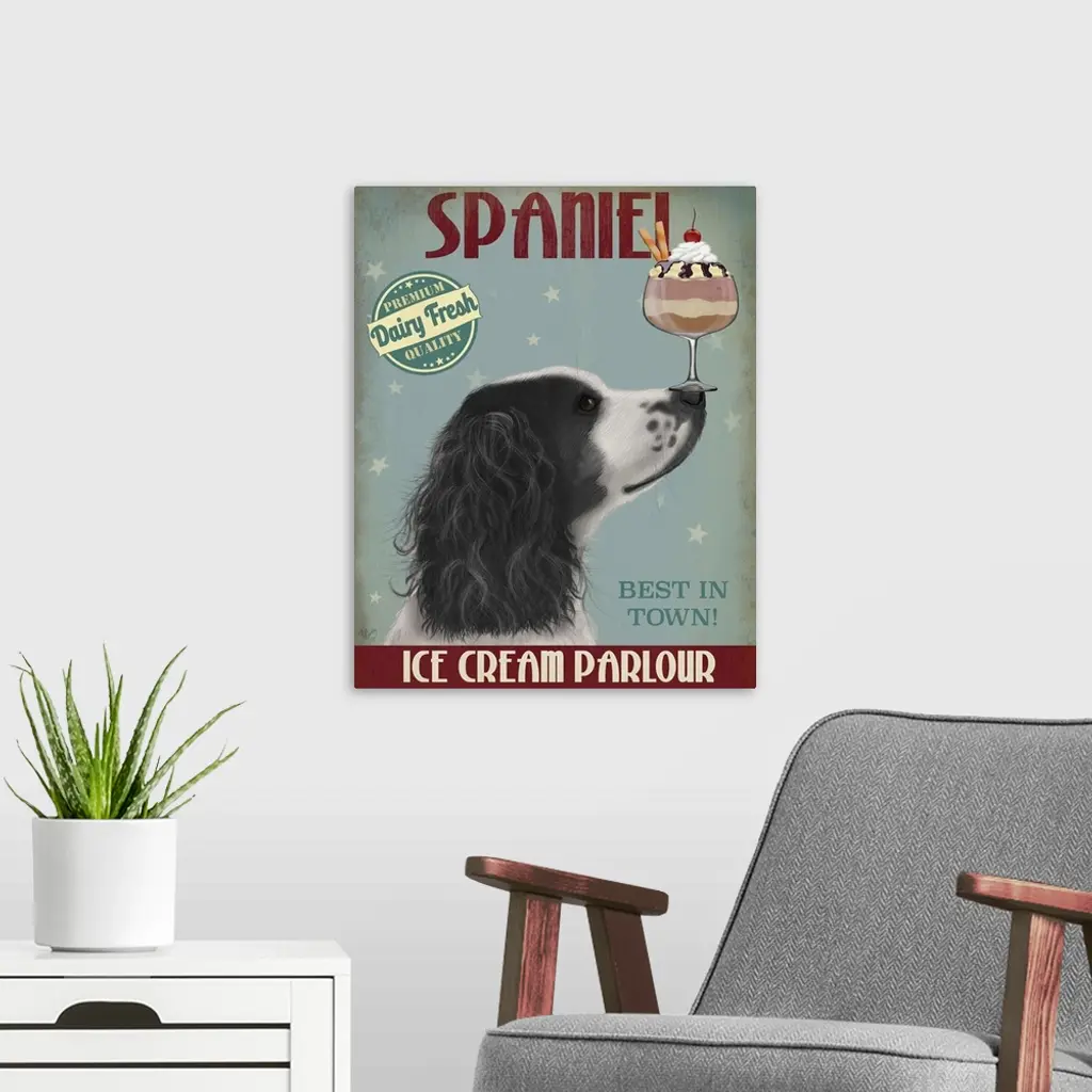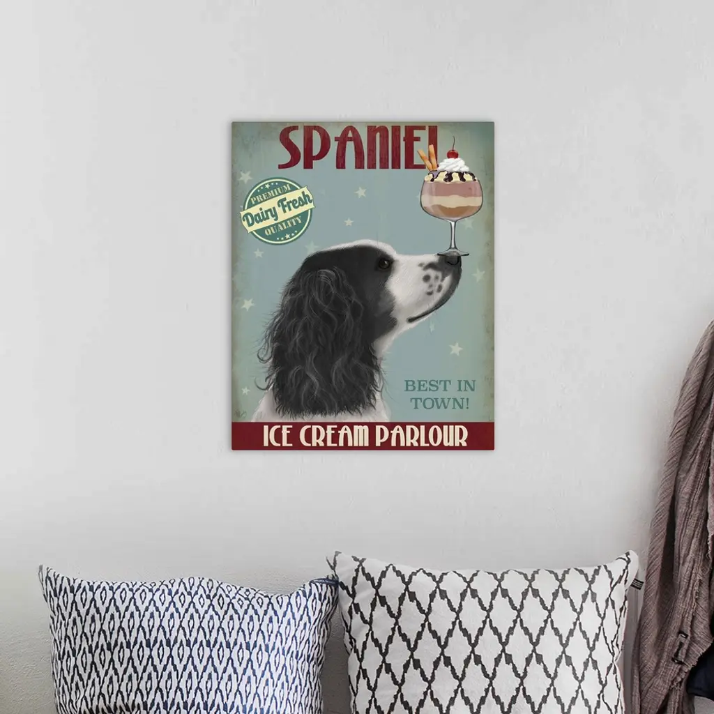 Decorative artwork of a Springer Spaniel balancing an ice cream sundae on its nose in an advertisement for an ice cream parlour.