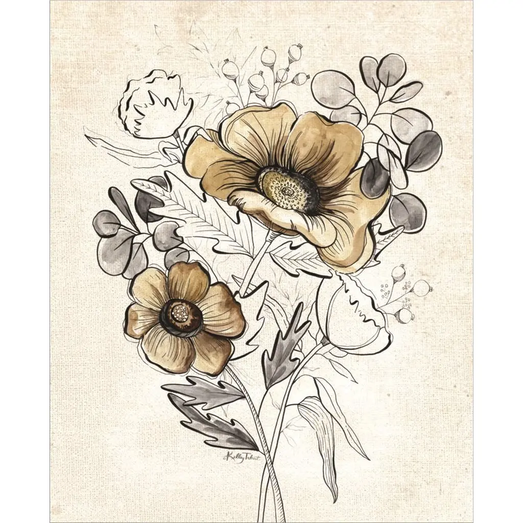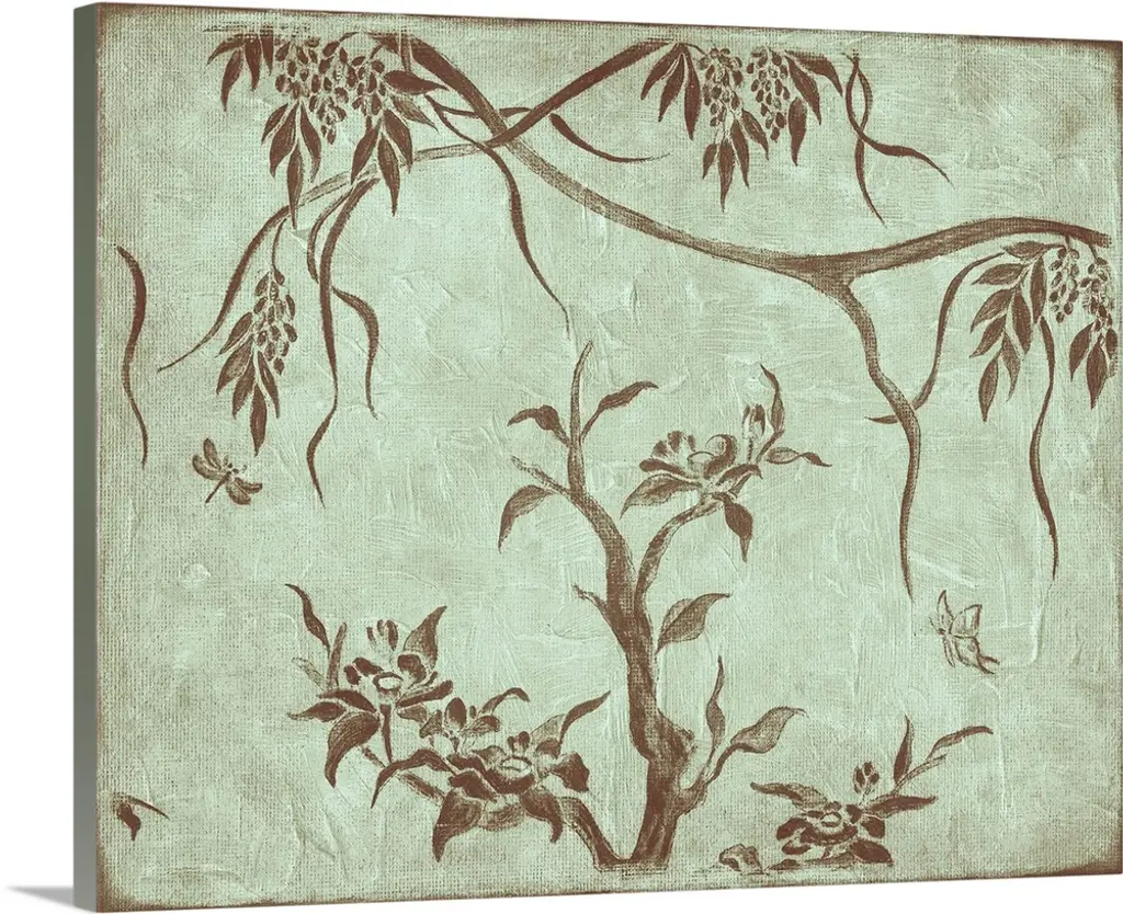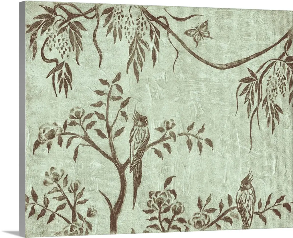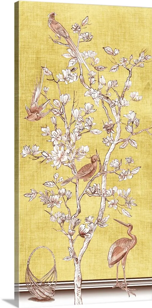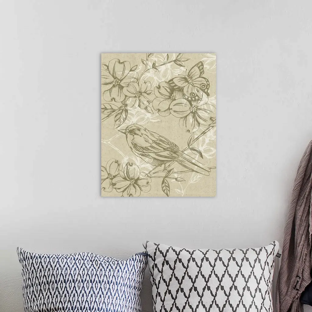 A delicate bird perches on a branch filled with flowers over a linen textured background with white flower designs in this decorative artwork.