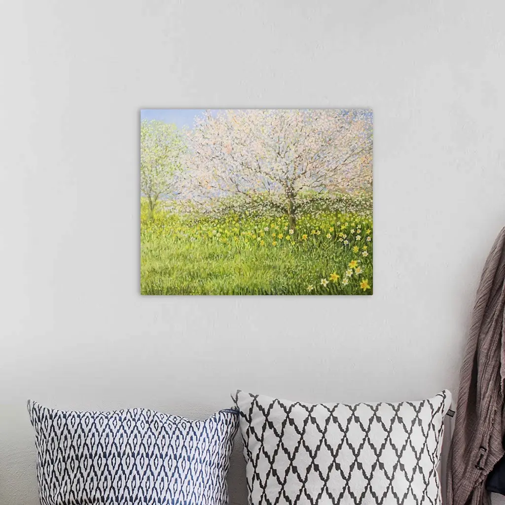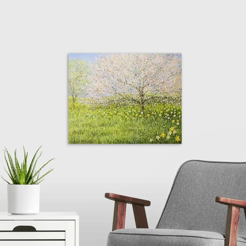 Originally an oil painting of a springtime natural landscape with blooming trees and colorful meadow full of daffodils.