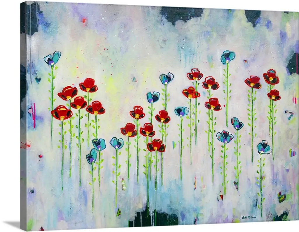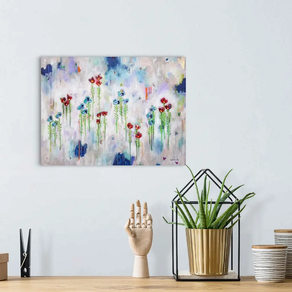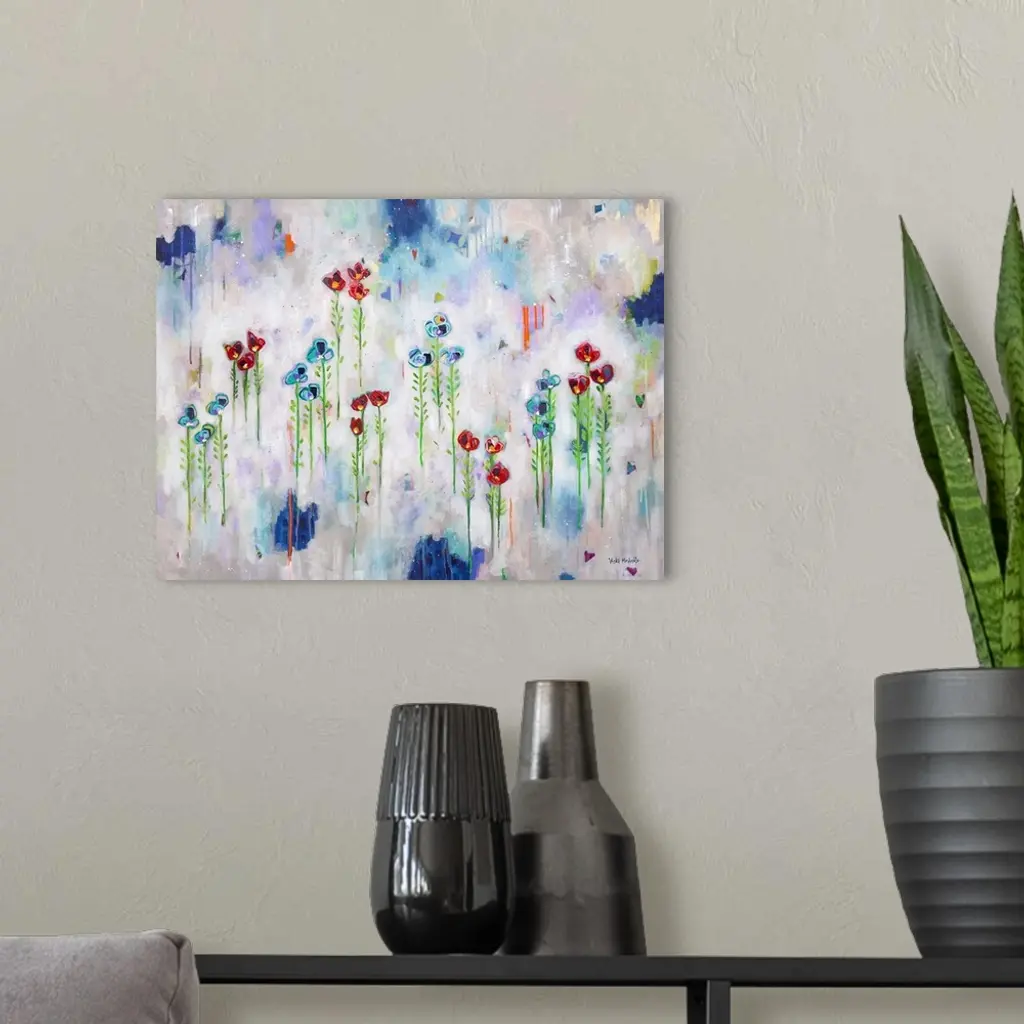 Vibrant abstract painting with blue and red flowers that appear to be floating in sets of three with long green stems and leaves on a colorful background.