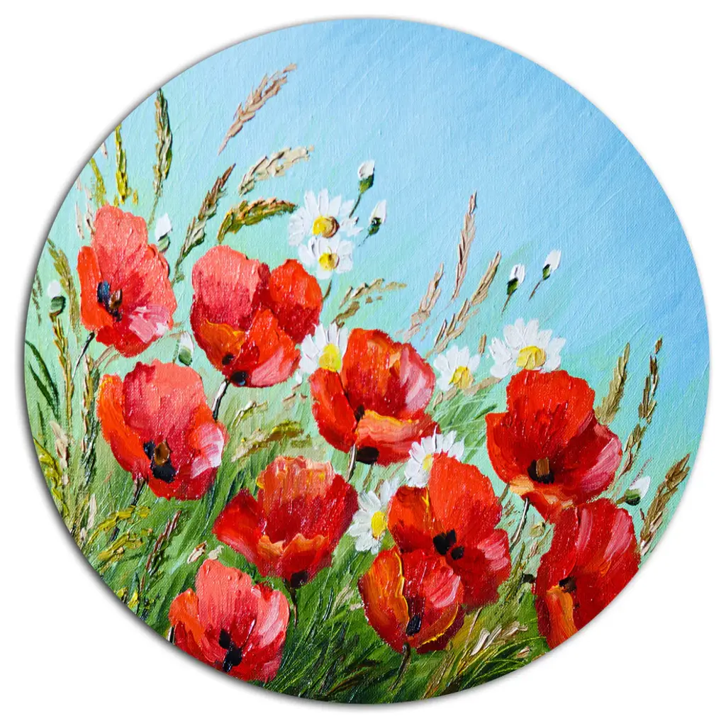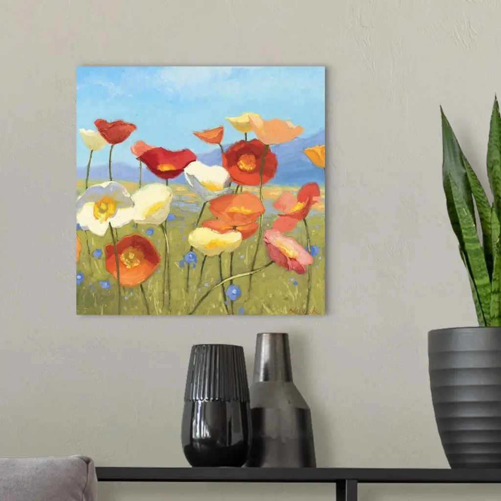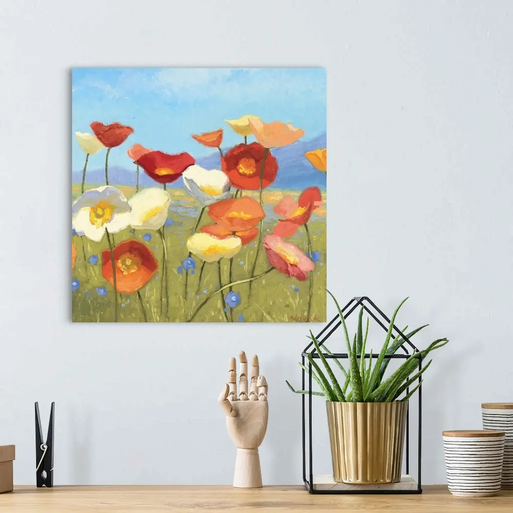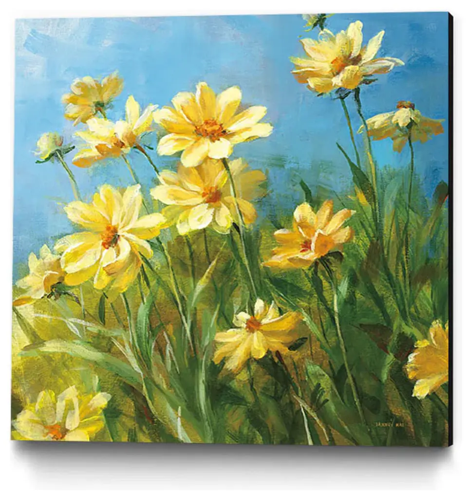 Contemporary painting of flowers in a green field, with a blue sky above.