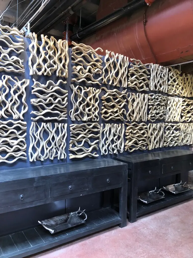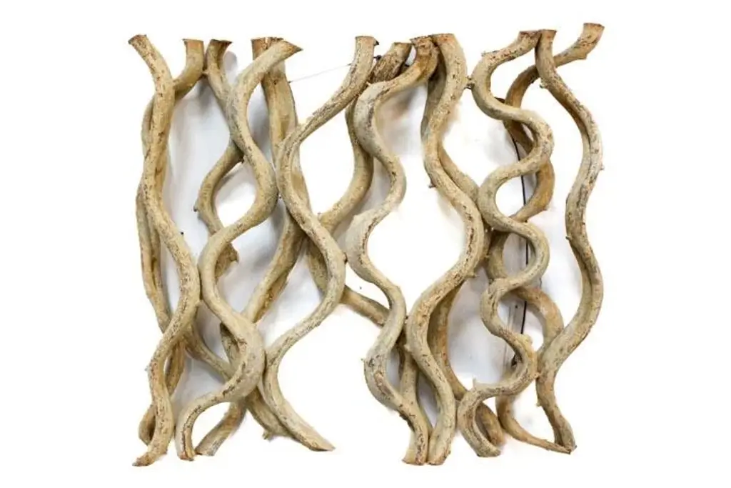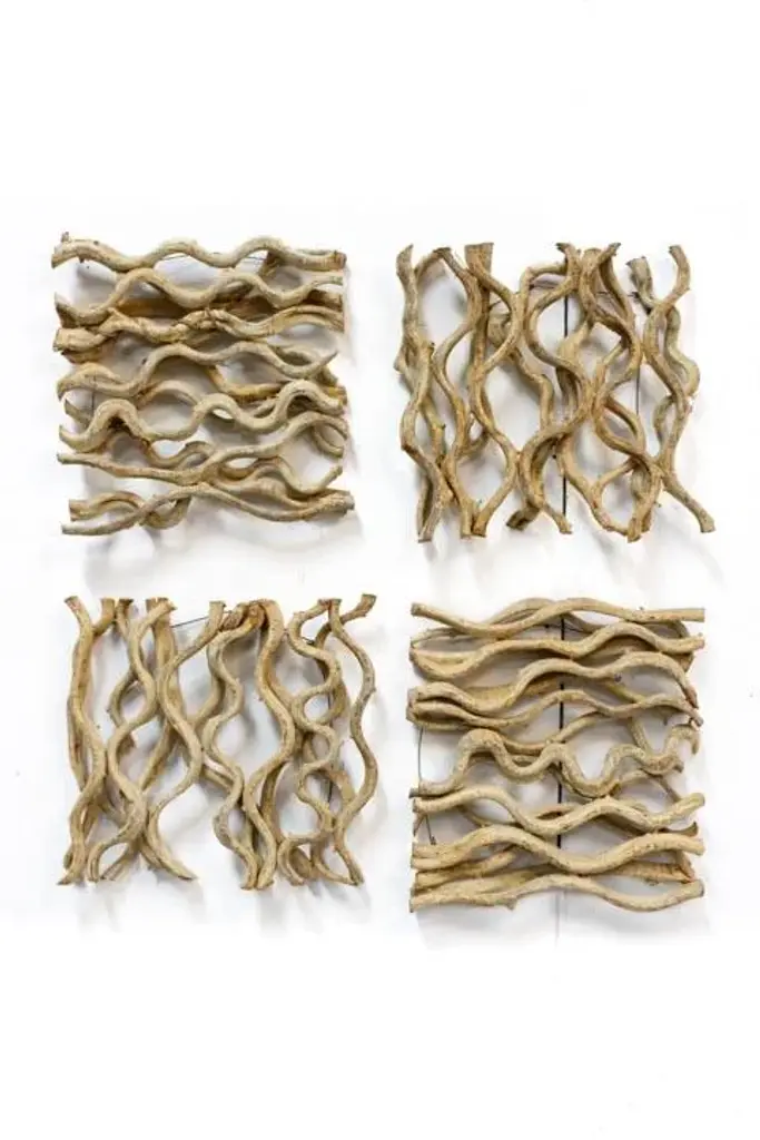 Enjoy these large Square Vine sculptures a unique handcrafted plaque. Great statement as a grouping or individually. Enhance your home experience with this transitional airy wall hanging. Use individually or combine with our rectangle wall hanging. Balance the elements of the room and add texture. Each item is one of a kind, as a product of nature; coloration throughout will vary slightly, neutral tan tones. Vine is arranged in a square pattern measuring 19 x 19.