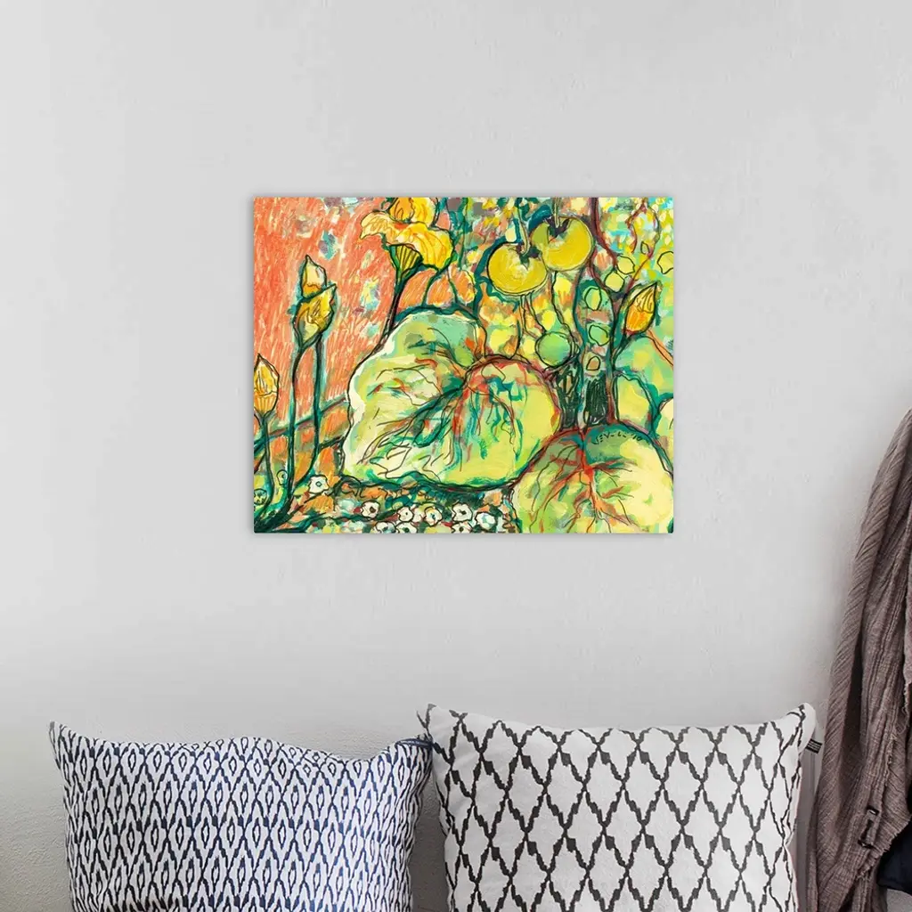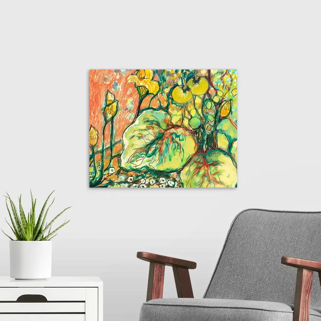 Large abstract painting on canvas of vegetables growing in a garden with flowers at the bottom.